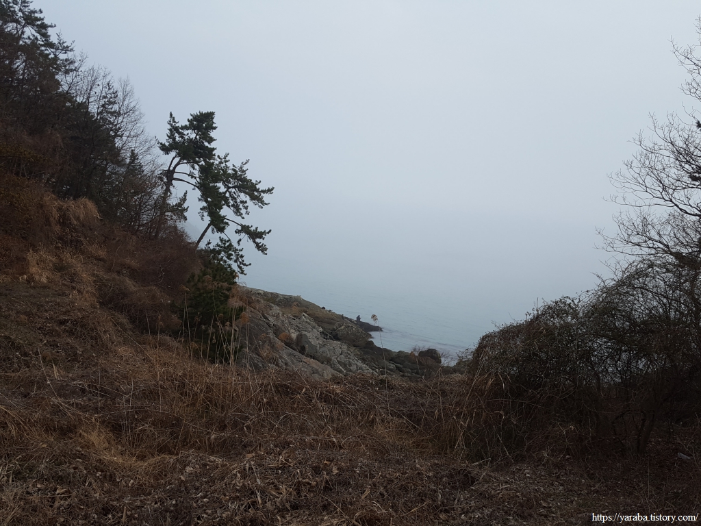 삼여도 해안에서 시작한 거친 길은 언덕 위로 올라서면 끝나고 평이한 숲길이 이어진다. 삼여도 해변에서 들어온 것으로 보이는 갯바위 위의 낚시꾼들의 수다 소리가 고요한 숲을 울린다. 해무가 가득하여 먼바다가 보이지 않는 잔잔한 바다에서 낚시를 하면 호수에서 민물낚시를 하는 느낌이 들지 않을까? 하는 상상도 해본다.
