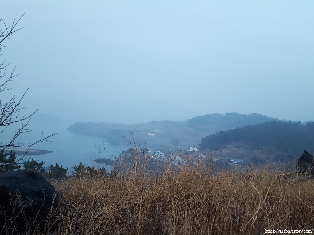 뒤돌아보면 해무가 시야를 흐리게 하지만 가까이에는 삼여도 해변, 멀리는 사촌 마을의 시루봉이 눈에 들어온다.