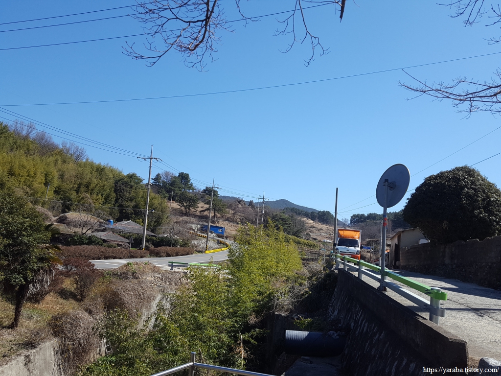 중현리 회룡마을을 출발한 남파랑길 46코스는 중현동 마을과 우물마을을 거쳐 사학산과 삼봉산 사이의 고개를 넘는다.