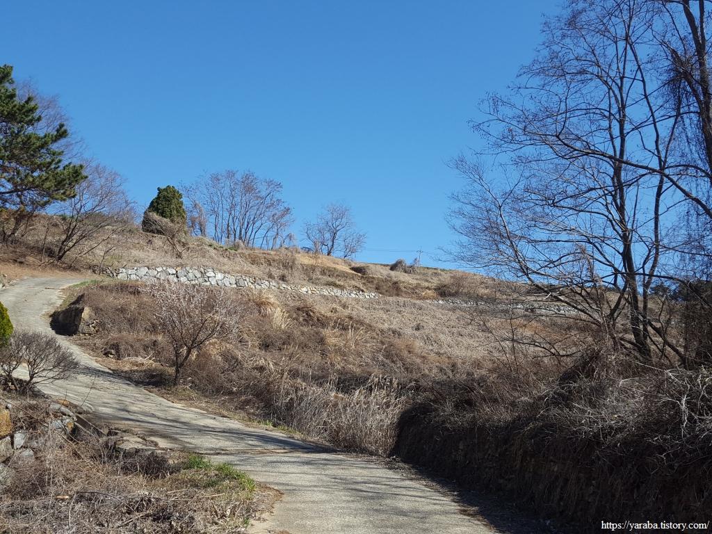 숲길 입구에서 잠시 쉬어가는데 그늘은 춥고 햇빛은 따갑다. 멀리 오르막 너머로 백년곡 고개가 보이는 것 같다.