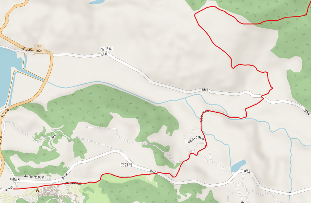중현 보건 진료소 앞을 출발한 남파랑길 46코스는 회룡 마을 내부를 가로질러 완만한 오르막길을 통해서 조금씩 고도를 올리면 중현동 마을로 향한다.