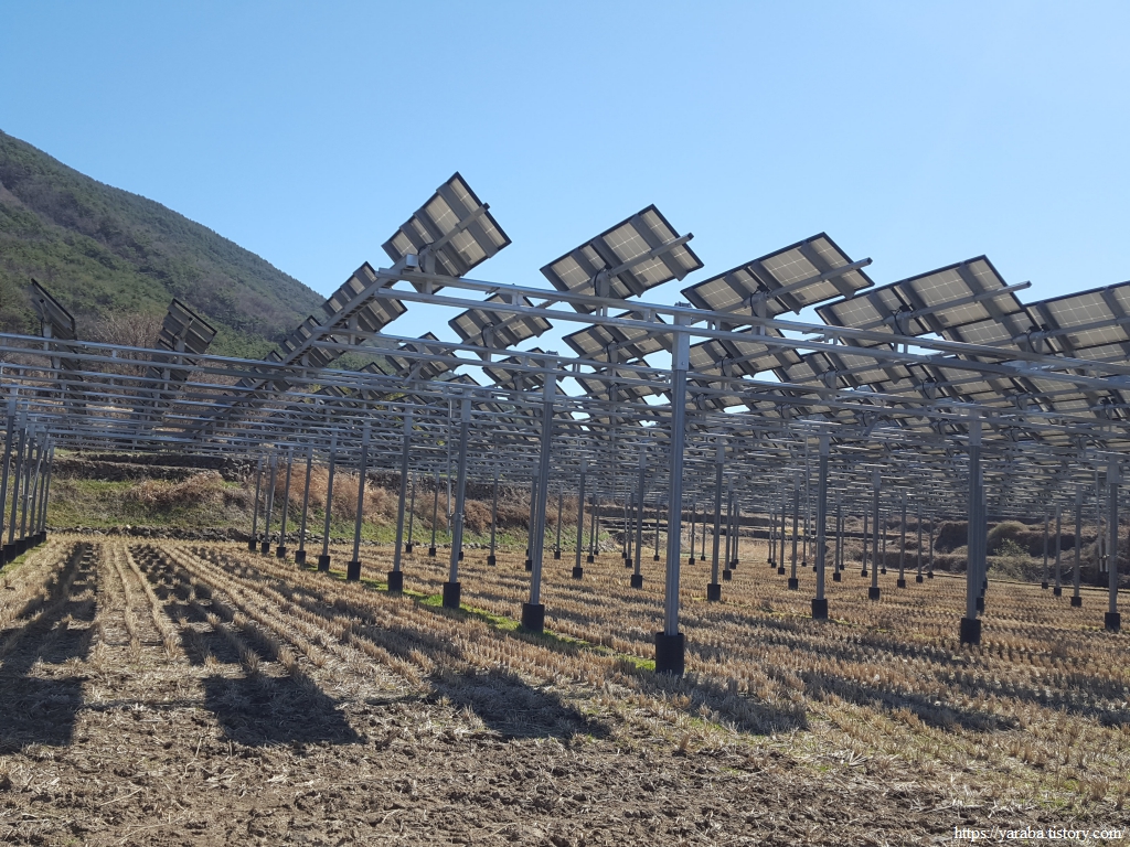 우물마을로 진입하는데 특이한 형태의 태양광 발전소를 만났다. 이른바 영농형 태양광 발전소다. 기존의 태양광 발전소를 볼 때마다 드는 생각은 지붕에 설치하는 발전 설비처럼 태양광 모듈 하부를 활용할 수 있으면 좋을 텐데 하는 것이었다. 영농형 태양광 발전소는 태양광 모듈을 작게 만들어서 상부에서는 발전을 하고 하부에서는 농작물을 재배할 수 있도록 한 것이다. 기계화된 농업에 맞게 농기계 작업이 원활하게 만들었다. 식물들은 매일 광합성에 필요한 햇빛이 채워지면 더 이상 광합성을 하지 않음에 착안한 것이라 한다. 아무튼 실제로 이런 논에서 벼를 재배해 보니 기존 대비 80% 정도의 수확량을 보였다고 한다. 설치비와 관리를 최적화하는 노력이 있다면 대단위 평야 지대가 대단위 태양광 발전소로 변모할 날이 곧 올 수 있지 않을까 하는 기대를 해본다.