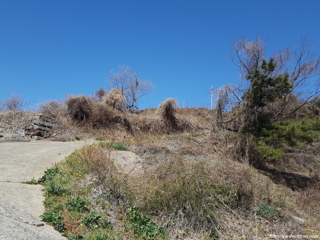 완만한 오르막을 오르며 마을길을 가로지르는데, 다랭이밭의 무너져 내린 돌담을 만난다. 농부의 손길이 더 이상 닿지 않는 밭의 모습은 잡초와 덩굴이 우거지다가 자연스럽게 저런 모습이 될 것이다.