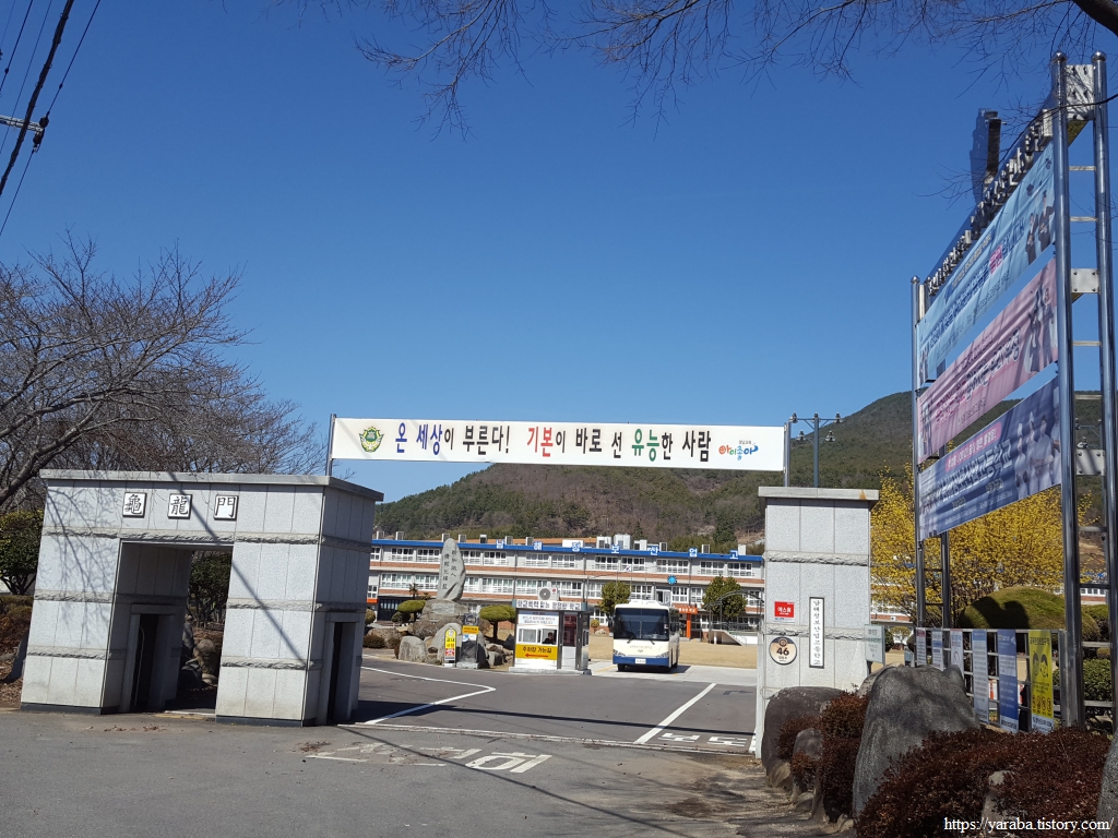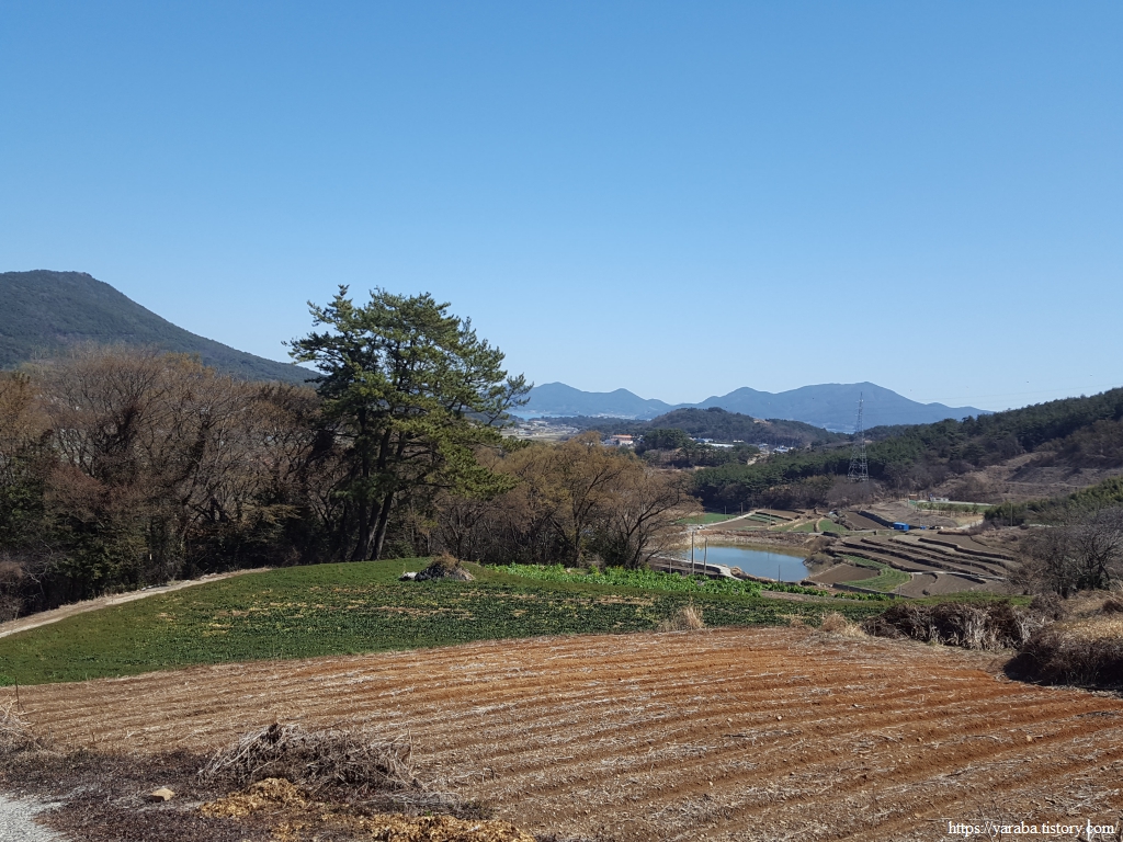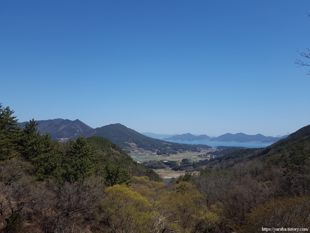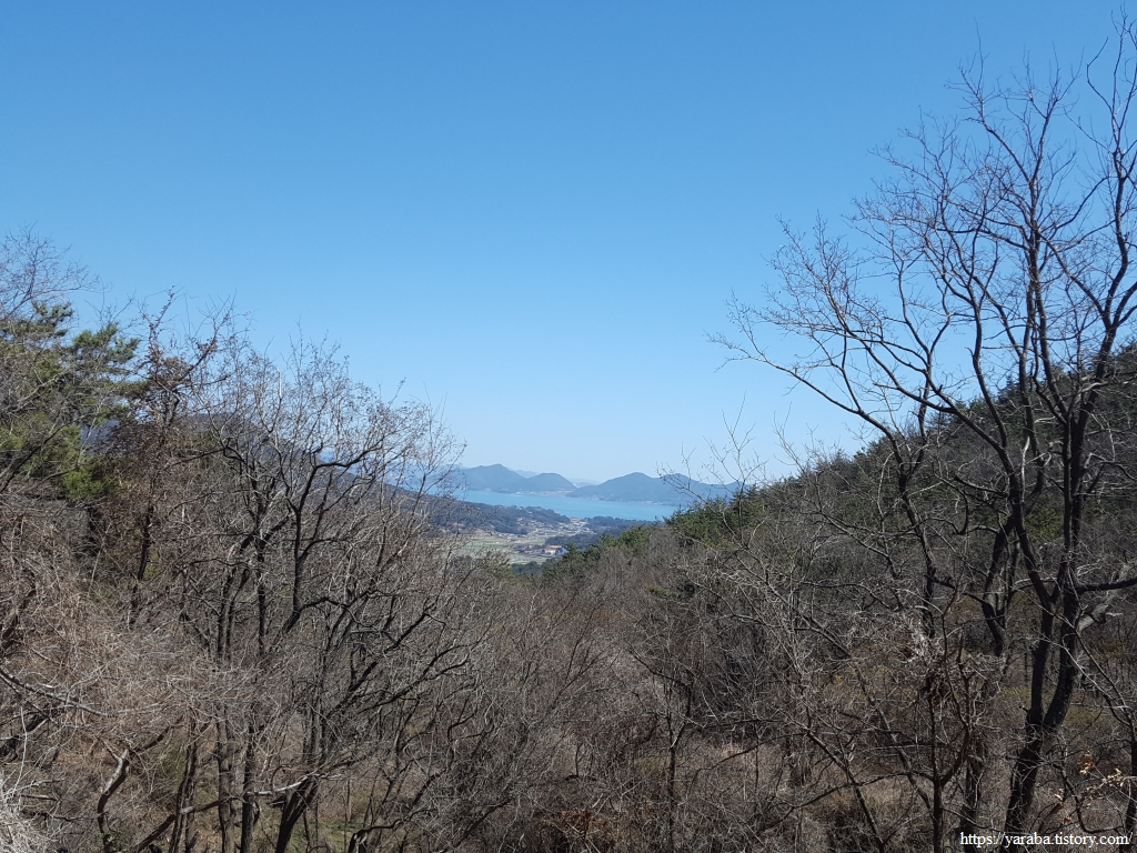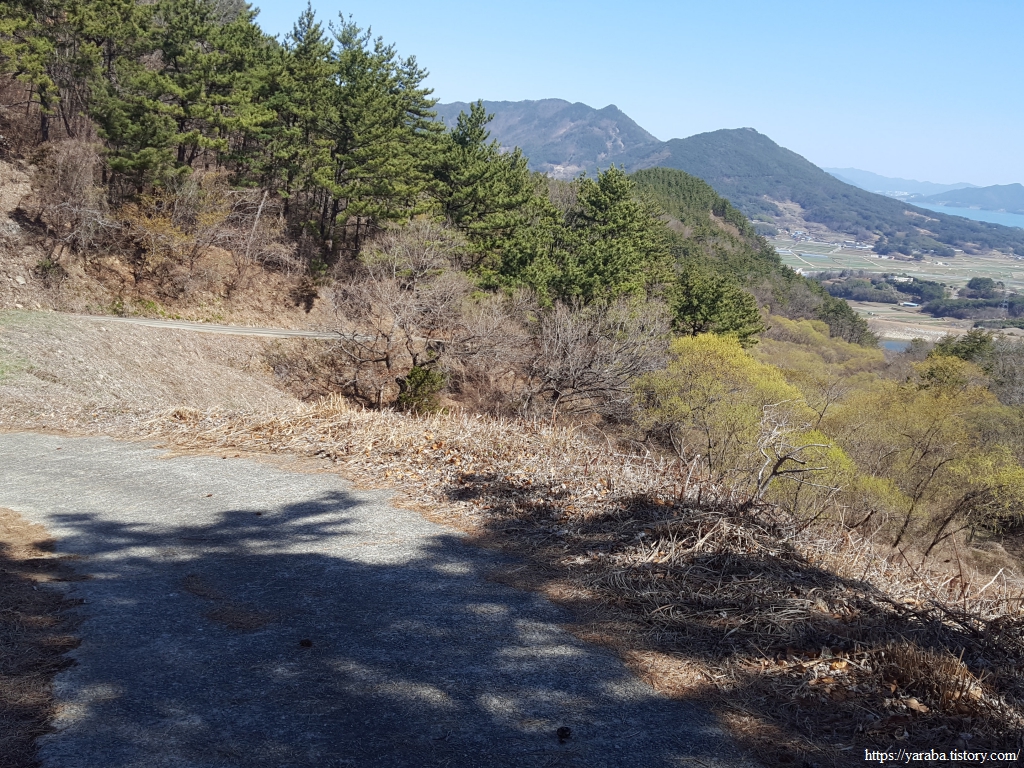 저 앞으로 보이는 바다가 어딜까? 하는 호기심에 하나씩 지형을 가늠해 본다. 바로 아래쪽에 있는 것은 백년골 저수지이고, 그 뒤로 작은 동산이 있는 건물은 폐교된 교현 중학교 건물이니 그 뒤로는 보이는 바다는 남해도와 창선도 사이의 바다이다. 남해군 남파랑길의 시작점이었던 창선도와 이렇게 이별한다.