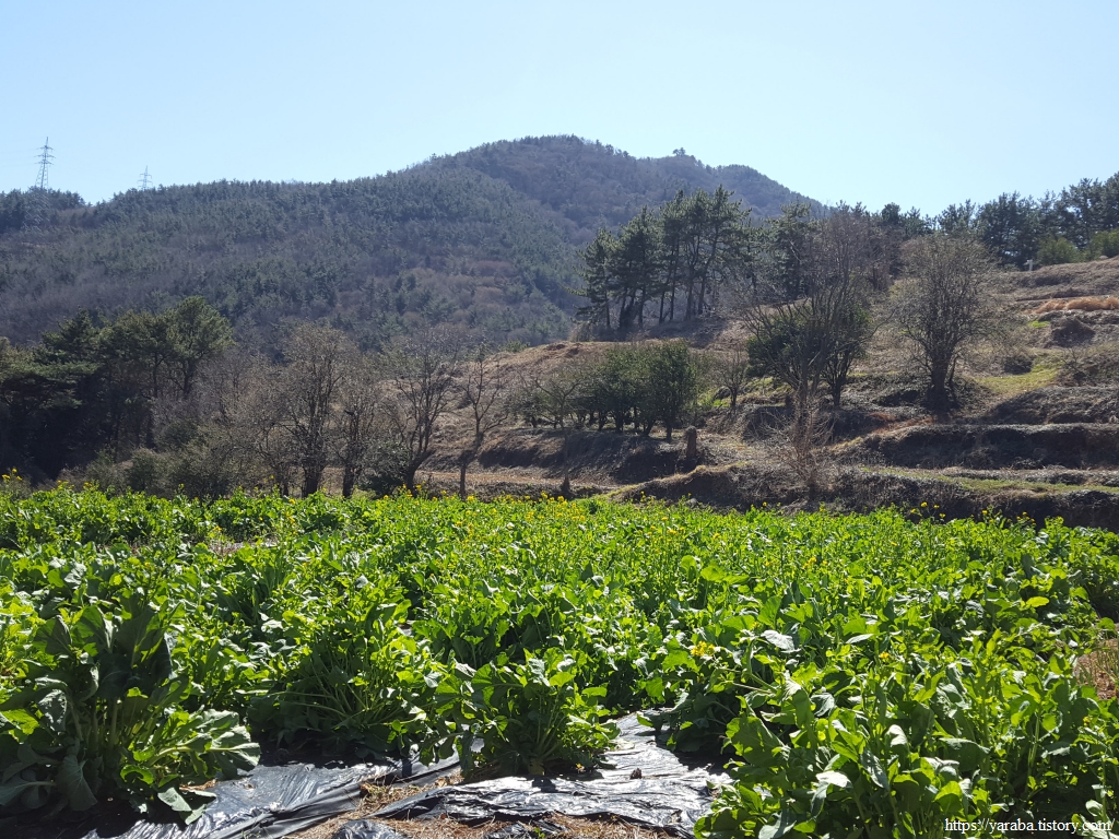 밭을 푸릇푸릇하게 덮고 있는 것이 무엇일까? 하는 호기심에 가까이로 가서 보니 노란색이 영롱한 유채였다. 이른 봄햇살에 영롱한 노란빛을 보니 눈이 상쾌해진다.