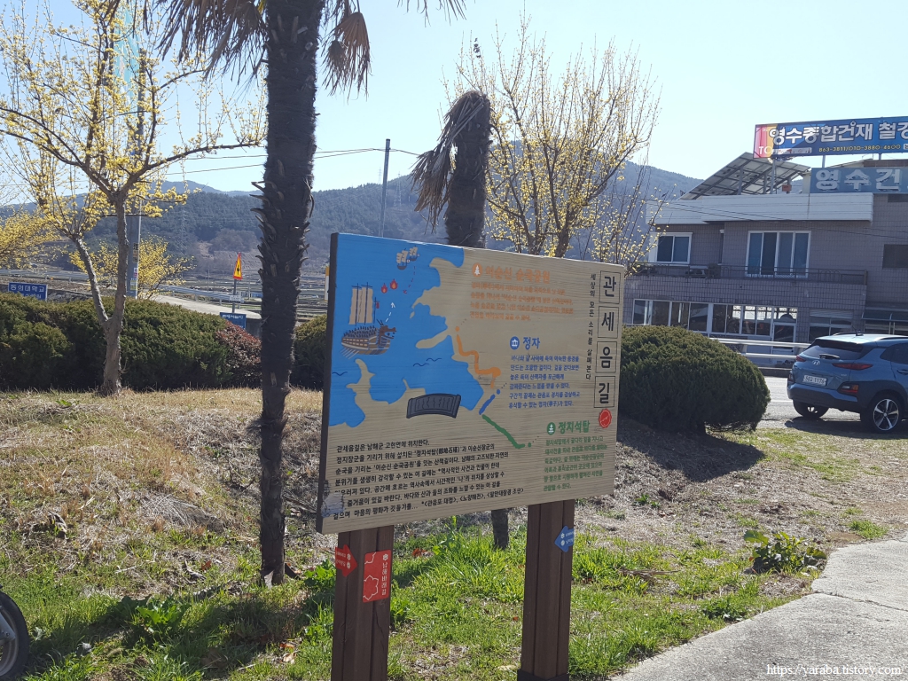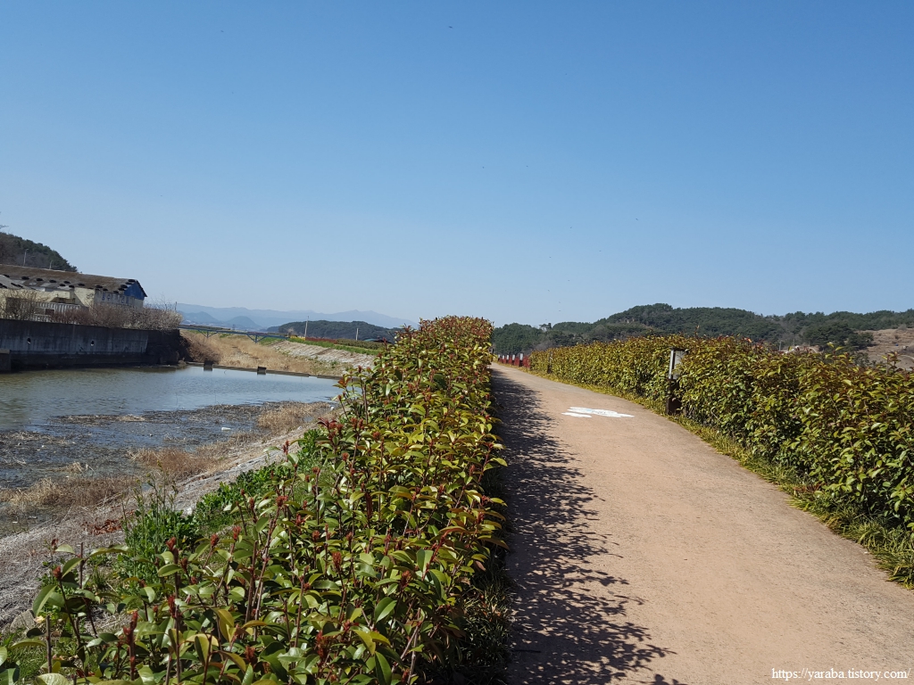 국도 아래를 지나온 남파랑길은 대사천 하천변을 걷는다. 고현둑방 화전별곡 이야기길, 관세음길이라는 이름도 있었다. 읍내의 정지 석탑에서 시작하여 대사천 하천변을 거쳐 이순신 순국 공원까지 남파랑길과 같이 간다.
