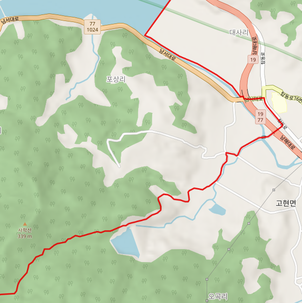 남치 저수지에서 출발하여 대사마을을 거쳐 바다로 흘러가는 대사천을 건너는 포상교를 지나 19번 국도 남해대로 아래를 굴다리로 통과하여 고현면 읍내로 진입한다.