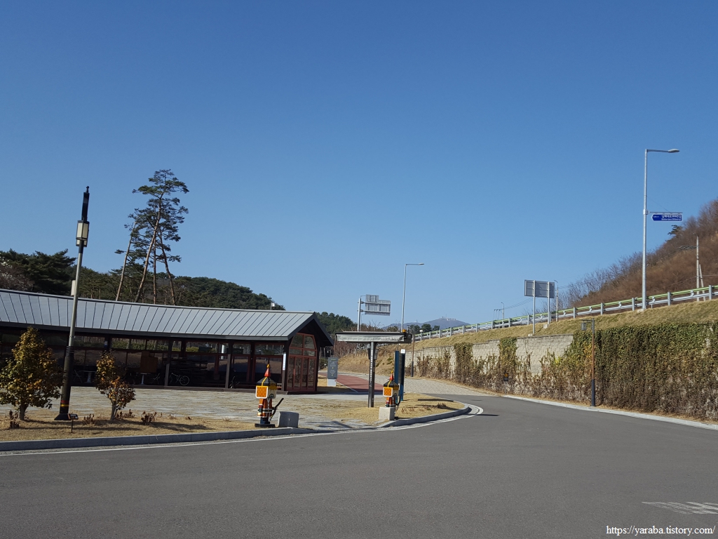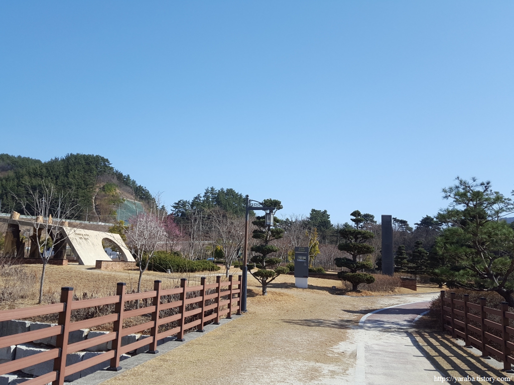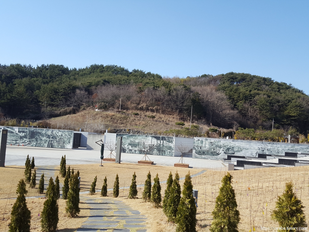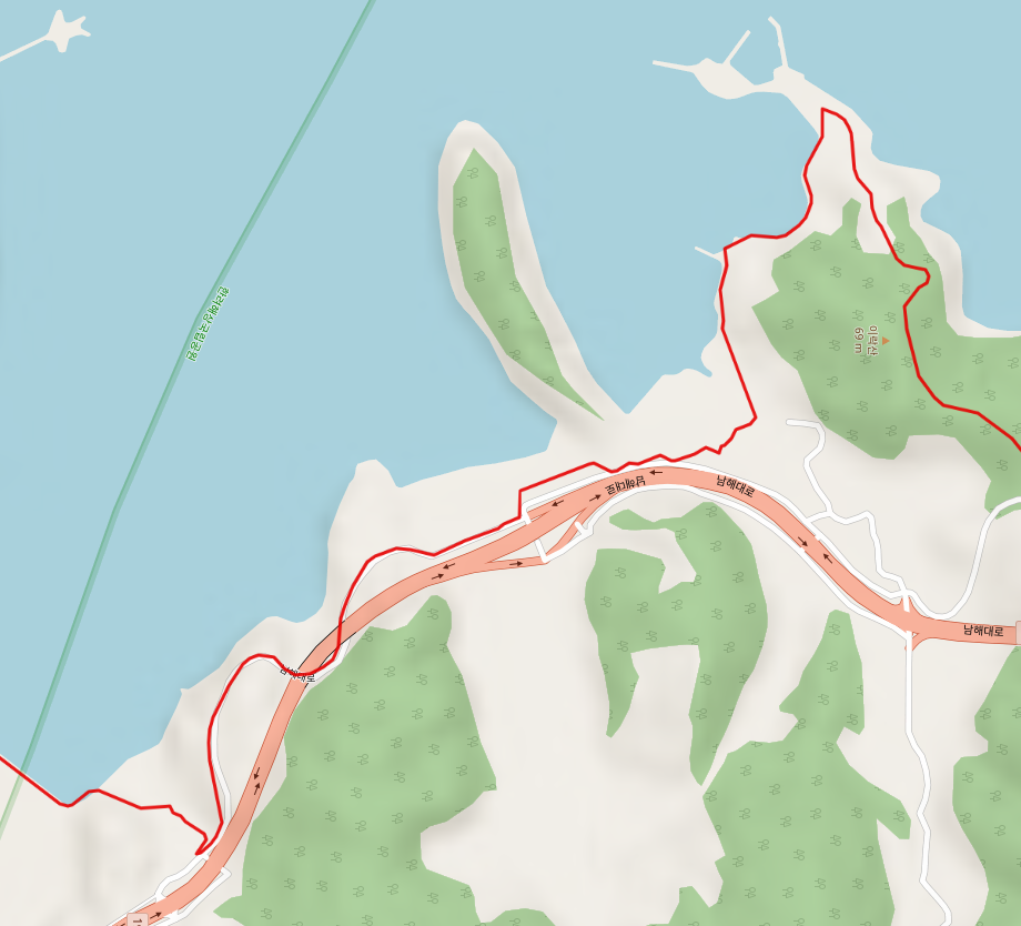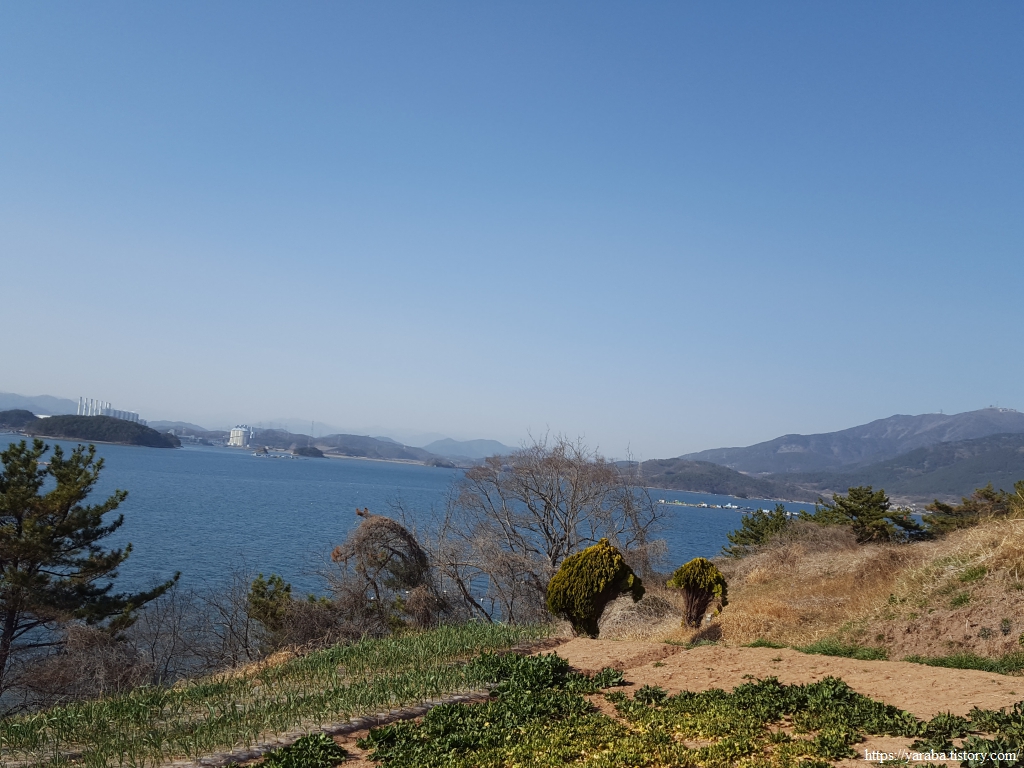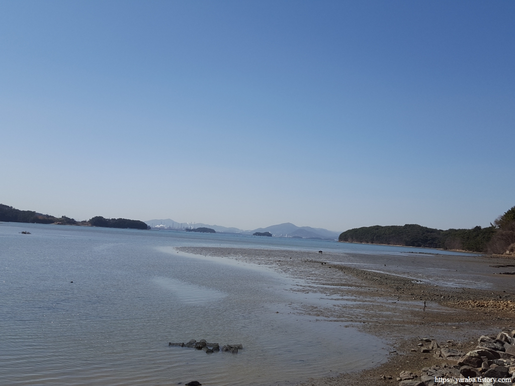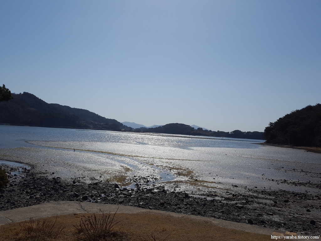 평일임에도 많은 사람들이 방문하고 있었다. 공원 중심부에 식당과 화장실과 같은 시설들이 몰려 있어 쉬어 가기 좋았다. 잠시 벤치에 앉아 오가는 사람들을 구경하며 이순신 장군의 마지막 노량 해전이 치러진 관음포 앞바다 풍경에 멍하니 빠져 본다. 잠시 휴식을 취하며 정비를 끝낸 우리는 다시 남파랑길 리본을 따라 호국 공원 쪽으로 길을 잡는다.