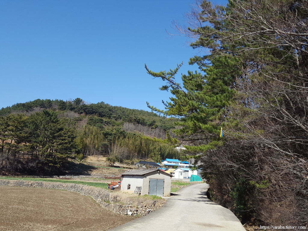 따스한 오후의 햇살을 받으며 걷는 길, 길은 해안에서 조용하고 아늑한 분위기의 방월마을 안쪽으로 들어간다.
