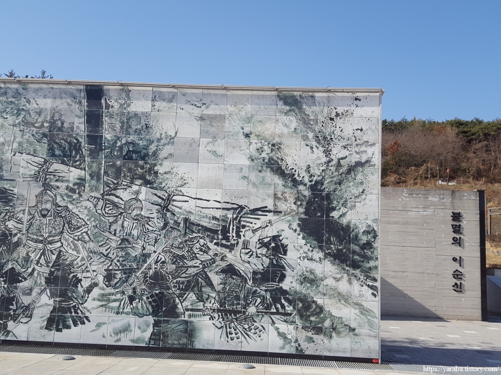 벽화는 명나라 수군과 조선 수군이 왜적을 쫓으며 벌어진 이순신 장군의 최후의 결전 노량해전의 모습을 도자기 타일로 만들어 붙여 놓았다. 높이 5m, 총길이 220m의 대형 벽화로 50 센터 타일이 3,800여 장 사용되었다고 한다. 일일이 구워 만든 명작이다.
