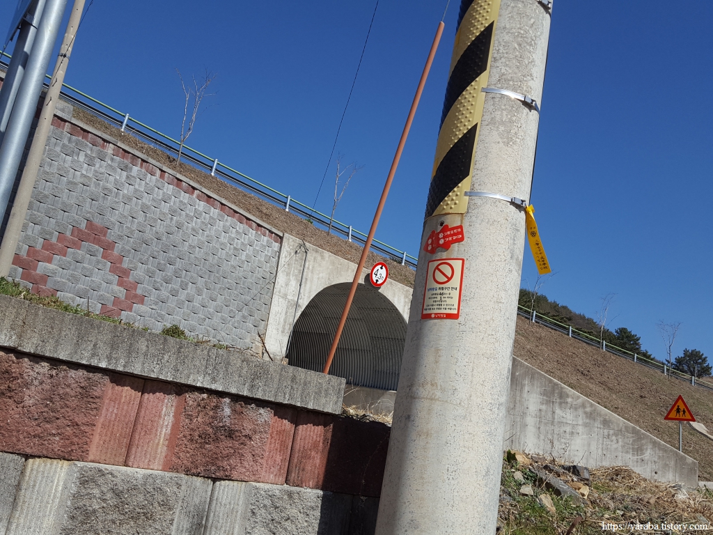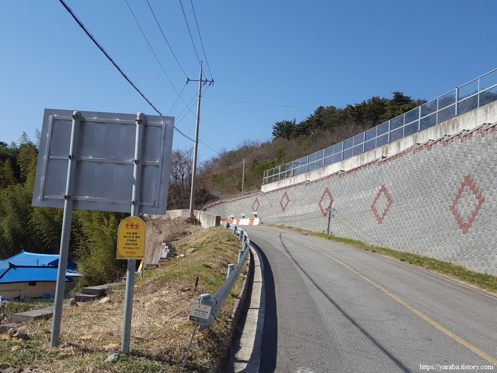1Km 정도 도로변을 걷는 위험 구간이라는 안내판이 전봇대에 붙어있었는데 아니나 다를까 도로변을 걸을 때면 늘 나타나는 남해 바래길의 한 줄로 걷기 가이드가 이제는 정겹다. 남해 구간에서 정이 들었나 보다. 다른 지역에서는 만날 수 없는 안내판이기는 하다.