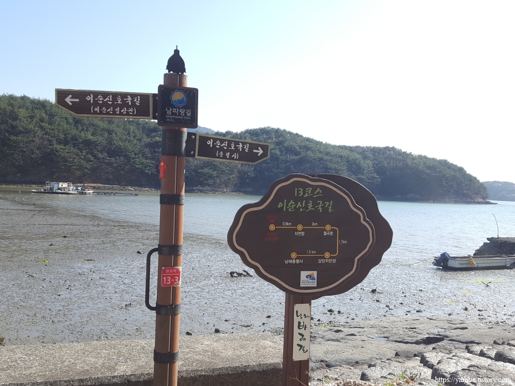 공원 이후로는 남해 바래길 13코스 이순신 호국길과 함께한다. 해안을 따라 이동하는데, 해안으로는 "구국희생"과 같은 이순신 장군의 호국 정신들을 새겨 놓았다. 나라를 위해 죽음을 불사하는 희생정신이다. 주입식으로는 되지 않는 마음이고, 지시로도 될 수 없고, 법으로 강제한다고 먹을 수 있는 마음은 아니다. 진심과 솔선수범이 앞서야 하는 것이고 하늘이 이끌어야 이심전심으로 먹을 수 있는 마음이 아닐까 싶다.