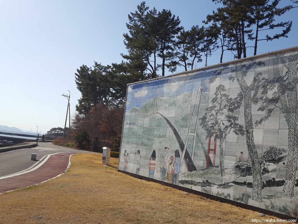 도자기 벽화는 끝자락에서 현대로 이어지며 노량대교와 남해대교, 나들이 나온 사람들이 등장하며 끝이 난다.