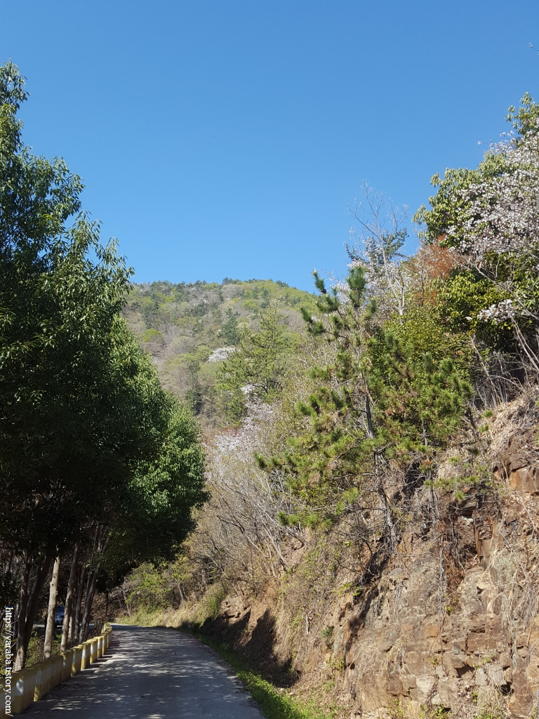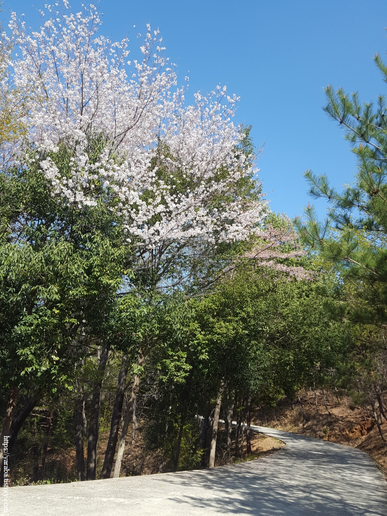 이제 제철로 도로를 벗어나 본격적으로 구봉산 임도로 진입한다. 경사가 조금은 급하지만 경사가 급한 만큼 오르막은 길지 않다는 희망을 가지고 천천히 오르막을 오른다. 임도 초입은 새순이 돋는 나무들, 꽃을 피운 나무들로 봄기운이 완연하다.