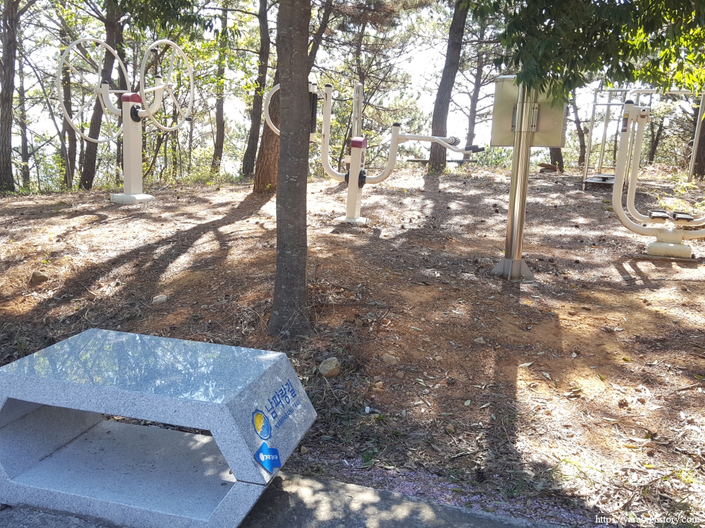 운동 시설이 있는 곳에 설치된 남파랑길 돌의자를 보니 독특한 디자인이 기억에 남을듯하다. 이곳에서 김밥으로 이른 점심을 먹으며 넉넉한 휴식 시간을 갖는다. 앞선 쉼터에서 스쳐 지나갔던 여성분도 우리를 따라 이곳에서 휴식을 취하신다. 말을 걸며 대화가 이뤄질까 싶었는데 멀찍이 앉아 간식을 드시니 자연스레 자신들만의 시간을 가진다. 어디서 왔냐? 어디까지 가냐? 하는 뻔한 대화도 나쁘지는 않지만, 방해받지 않는 휴식도 좋다.