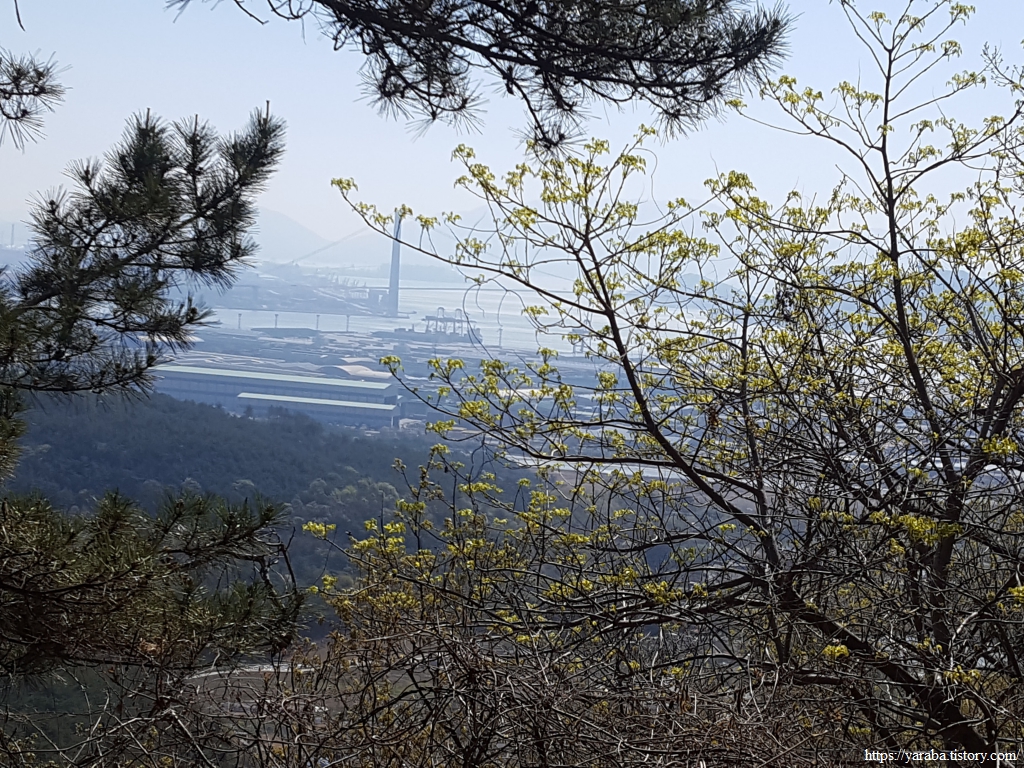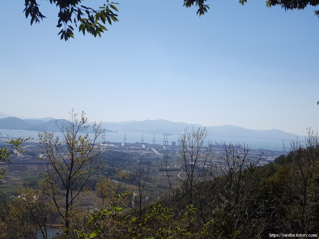 헉헉거리며 길을 오르다 쉼터를 만났는데, 중년으로 보이는 여성 혼자서 자리를 잡고 쉬고 계셔서 그냥 지나가기로 한다. 말을 걸고 인사하는 것도 좋기는 하지만 때로는 조용히 쉬고 싶을 수도 있으므로...... 조금 더 걸으니 남쪽으로 전망이 열린 곳에서 광활한 광양항이 눈에 들어온다. 광양항 중간에 우뚝 솟은 여수광양항만공사 건물이 존재를 뽐낸다.