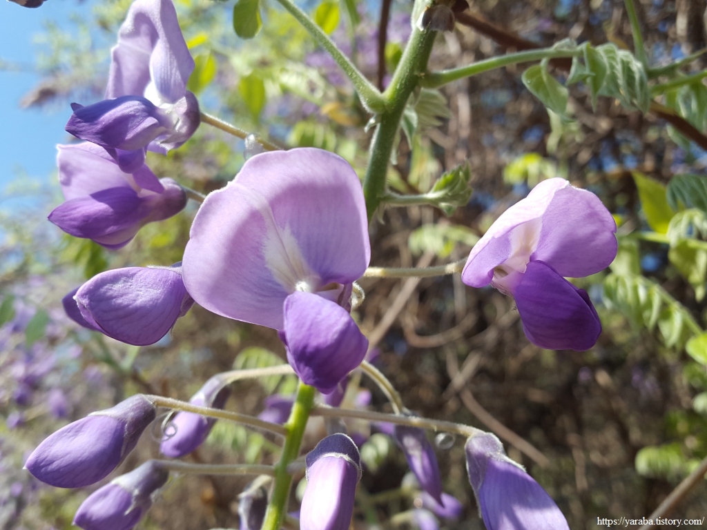 삭막한 분위기의 산업도로를 밝혀주는 존재가 있다. 주렁주렁 포도송이처럼 탐스러운 꽃을 자랑하는 연자줏빛의 등나무꽃이다. 거의 앞만 보며 걷던 우리의 코를 향기롭게 자극하여 주위를 두리번거리다 보니 아름다운 자태의 등나무꽃을 발견하게 되었다. 대나무 사이에서 철망을 타고 올라와 향기를 내뿜는 등나무를 떠나기 아쉬울 정도였다.