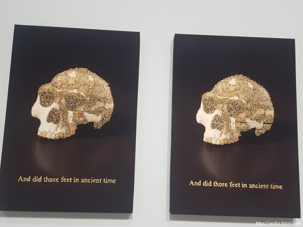 모양은 해골이지만 아주 작은 글씨들로 이루어진 해골이다. "and did those feet in ancient time"라는 문구로 19세기 초 영국의 윌리엄 블레이크의 시 제목이다. 그의 시는 영국의 애국가 수준인 예루살렘 찬가의 가사에 해당한다. "옛적에 발걸음을 행하셨도다" 정도의 해석이다.