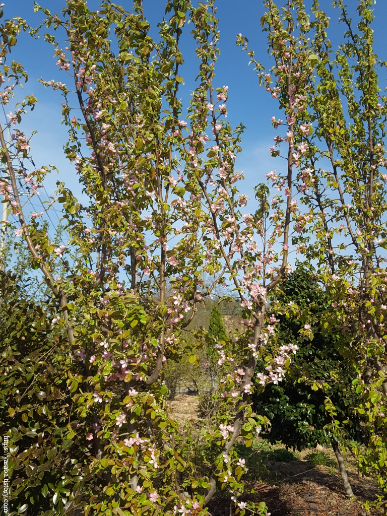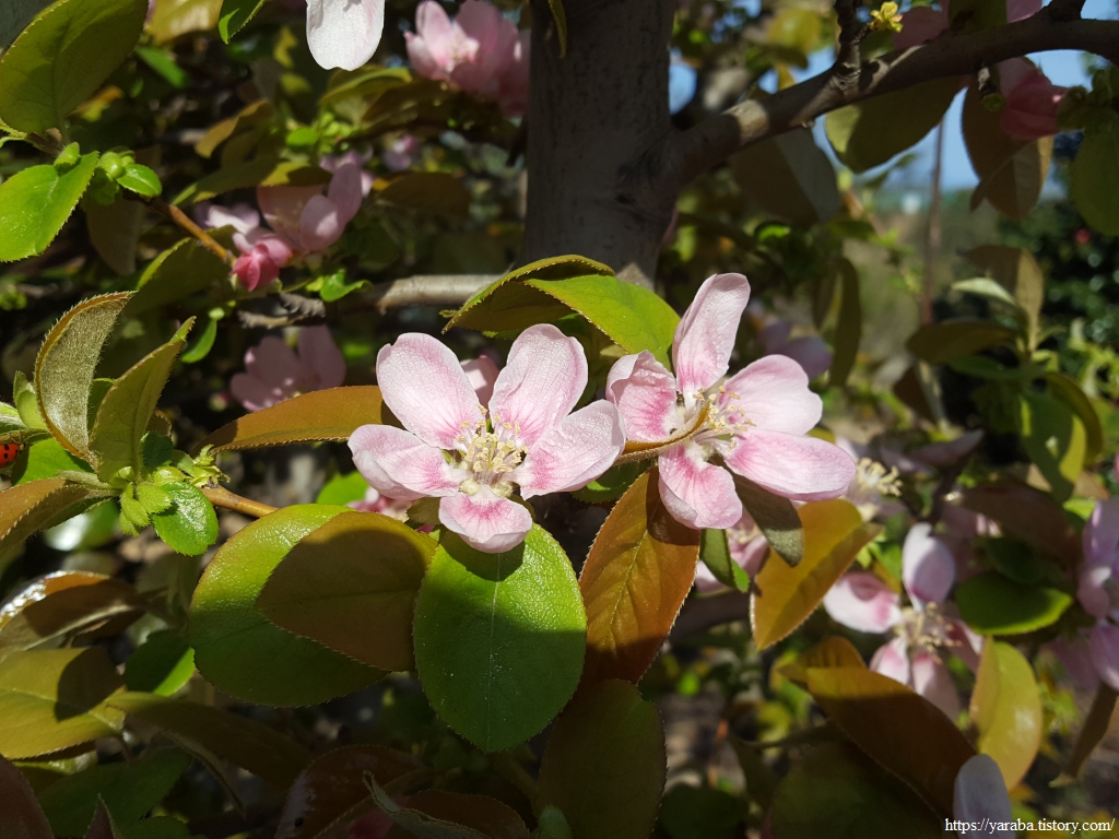 어느 집 정원에 활짝 꽃을 피운 나무가 발걸음을 붙잡는다. 모과나무의 꽃이다. 참외 크기의 향기로운 열매는 보았지만 모과나무의 꽃이 이렇게 화려한 것은 처음이었다. 긴치마 입은 봄처녀의 자태 같다.
