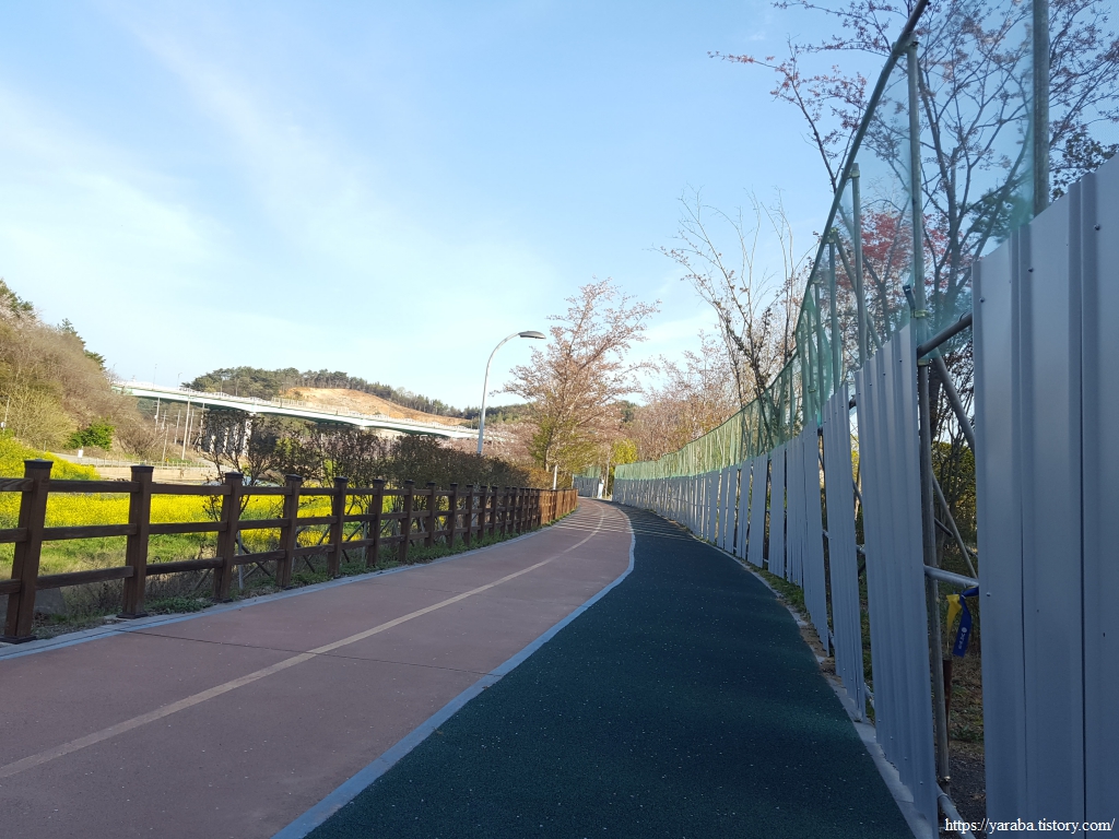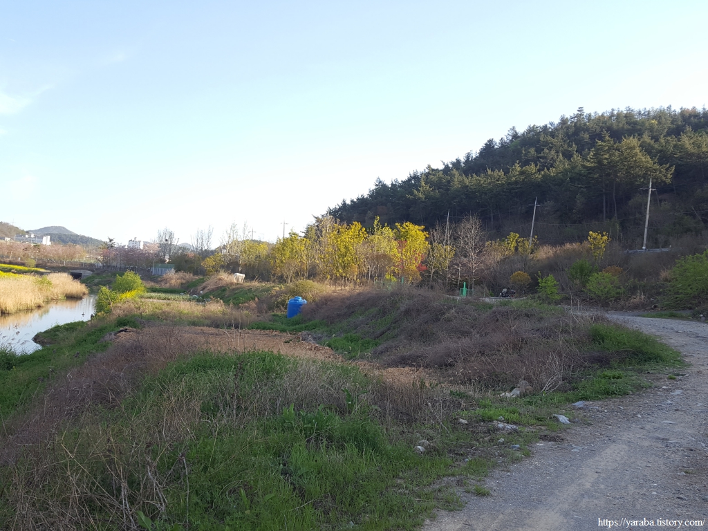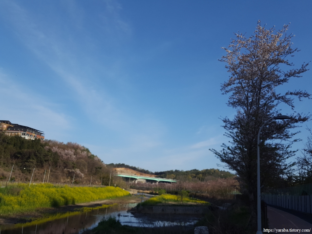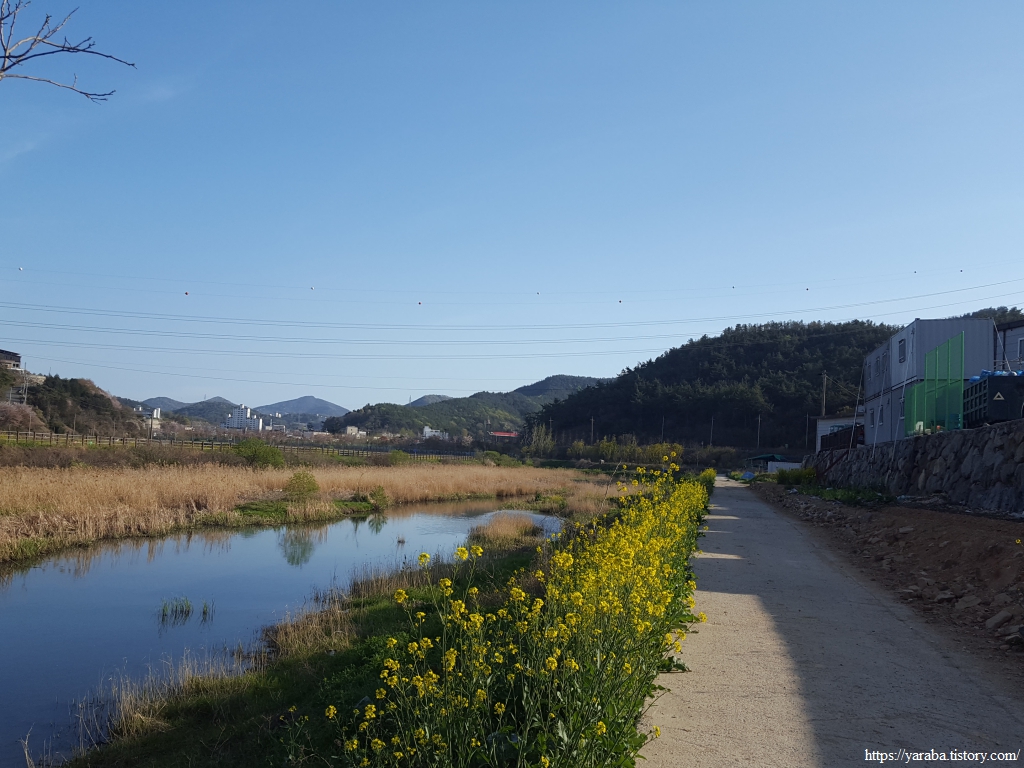 쌍봉천을 따라 걷는 길, 노란 유채꽃, 푸릇푸릇 연한 앞을 내고 있는 나무들, 파란 하늘과 그 하늘을 담아 거울처럼 빛나는 하천, 오후의 태양을 가린 산 그림자까지 낮은 산 사이의 계곡이 주는 포근함이 더해지니 참 좋다.