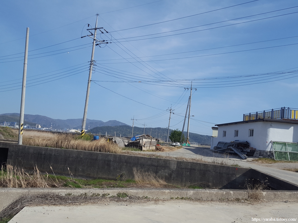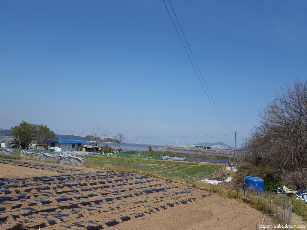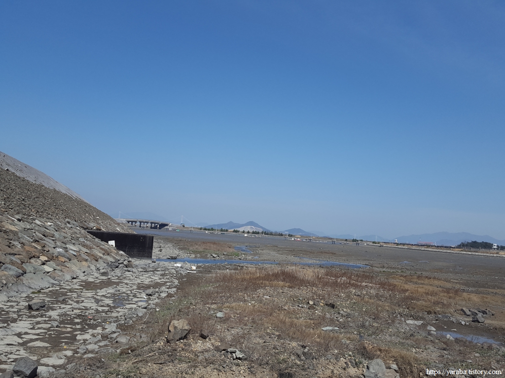 공사 중인 율촌 제2산업단지로 연결되는 신산 2교 다리 아래를 통과하여 해안선을 따라 남쪽으로 내려간다. 아직 매립이 끝나지 않은 산업단지의 외곽 방조제와 여수 공항의 외곽 방조제를 보며 저곳에 저런 게 있구나 하며 길을 이어간다. 멀리 동쪽으로 보이는 이순신대교가 광양 걷기의 기억을 끄집어낸다. 그렇지만 매립지 주위는 늘 삭막한 분위기가 풍긴다. 사람의 손이 경제적 논리로 만든 인공물은 잘하면 좋은 조경물이나, 그냥 두거나 정성을 쏟지 않으면 삭막할 수밖에 없다.ㅠㅠ