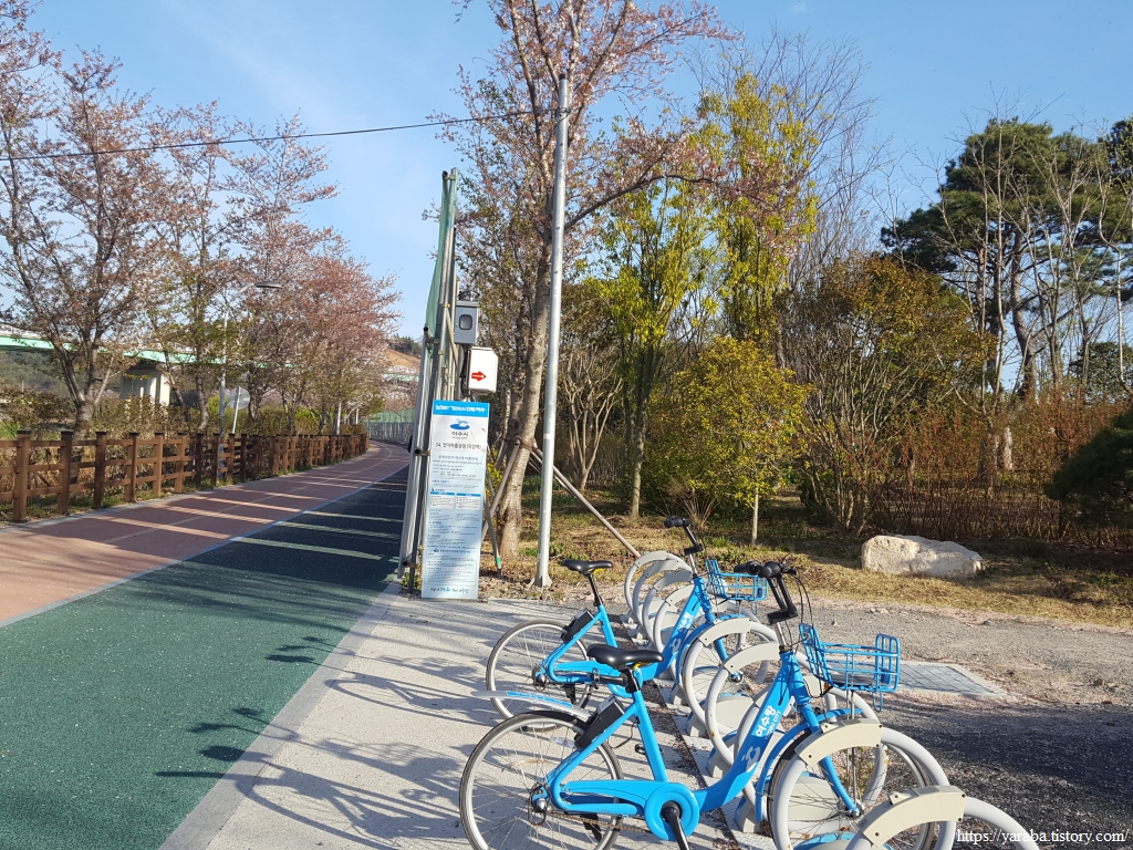 옛 덕양역에 도착하니 전라선 폐선을 활용한 깔끔한 산책로와 자전거길이 시작된다. 옛 덕양역 부지는 양지 바름 공원으로 변모하고 있었다. 걷기 여행을 하다가 공공 자전거를 만날 때면 얼마간 이걸 타고 걷기를 대신할 수 없을까? 하는 유혹에 빠지곤 한다. 경로에 대한 정보도 사용방법에 대한 확신도 없으니 늘 유혹에 그치고 마는 것이 아쉽지만 걷기 여행의 일부 구간에서 공공자전거를 쉽게 탈 수 있다면 좋겠다는 생각을 해본다. 여수시의 공공 자전거 이름은 여수랑이라고 한다.