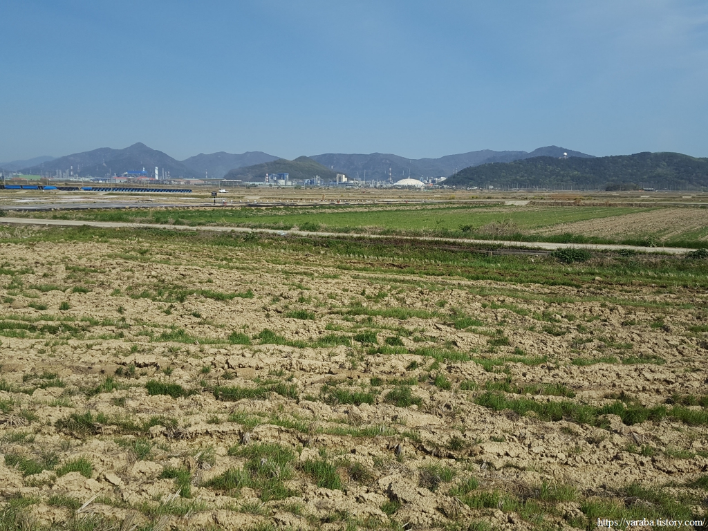 현재 남파랑길이 지나고 있는 소라간척지는 여수에서 가장 넓은 농경지로 지금은 본격적인 모내기를 시작하고 있지 않지만 실제 눈으로 보아도, 지도로 보아도 엄청난 넓이의 농경지가 펼쳐진 곳이다. 소라 간척지의 역사는 일제 강점기까지 거슬러 올라간다. 이곳 대포리와 남쪽의 관기리에 드넓은 소라 간척지가 조성되어 있다. 대포리 간척지 너머 멀리로는 여수 국가 산업단지의 석유화학 업체들의 공장들이 시야에 들어온다.