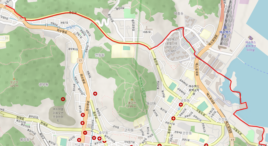 여수 터미널을 출발하면 터미널 앞 교차로를 건너서 동쪽으로 충민로 도로변을 걷는다.