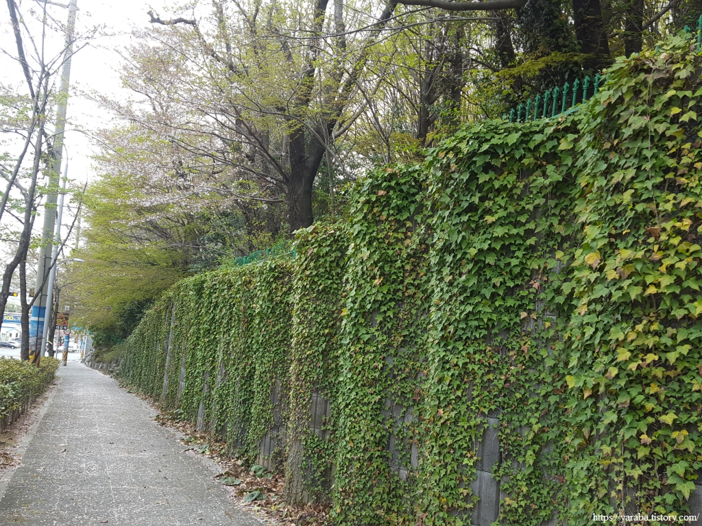 그렇다고 충민로 도로 담벼락이 담쟁이 한 가지로 채워지지는 않았다. 어떤 곳은 나무로 자연스러운 모습을 연출하고 있었다.