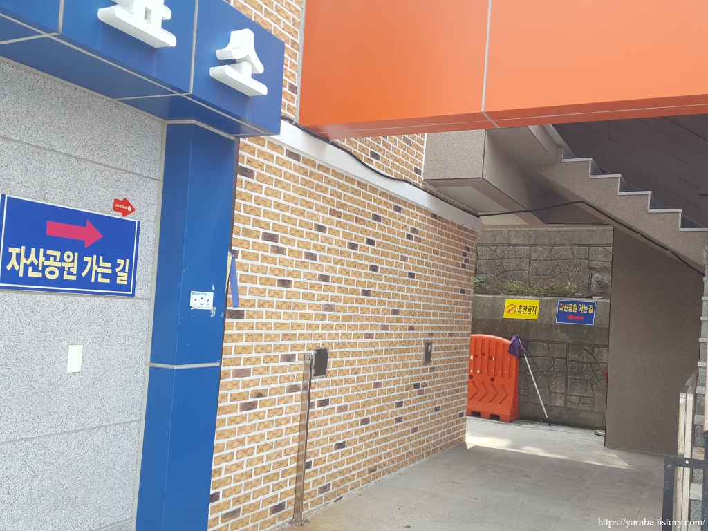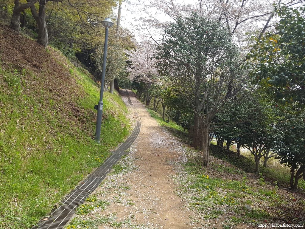 산책로는 거북선 대교를 지나서 우측으로 계단을 내려가는데 거북선 대교를 지났다는 말은 발아래로 지나는 자산 터널 위를 통과했다는 말이기도 하다.