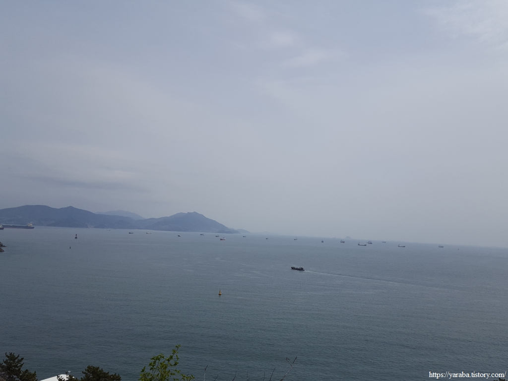 자산에 올라서니 앞바다로는 인근에 거대한 산업단지를 가지고 있는 도시답게 큰 배들이 줄지어 정박해 있다. 바다 건너 남해는 얼마 전 우리가 걸어서 지나갔던 곳일 것이다. 남쪽으로는 조선소가 살짝 보이는 돌산도가 길게 뻗어있다.