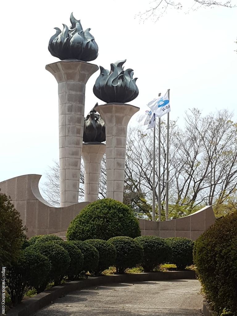 공원을 내려가는 길에는 일제강점기 일본군이 만들었던 고사포 진지에 대한 안내문과 충혼탑을 만난다. 지금 여수 공항은 율촌면에 위치하고 있지만 마지막 항전을 준비하던 일본군은 신월동 해안으로 해상 비행장을 만들었다고 한다. 해상 비행장을 보호하기 위해 이곳에 포대를 설치했다는 설명이다. 그런데, 일제가 패망하고 국군 14 연대가 그 해상 비행장에 주둔하게 되었는데 제주 4·3 항쟁 진압을 위한 파병에 반대하는 군인 봉기가 발생하면서 여순 사건이 발생했다고 한다. 충혼탑과 함께 공원 뒷자락은 마음을 숙연하게 하는 공간이다.