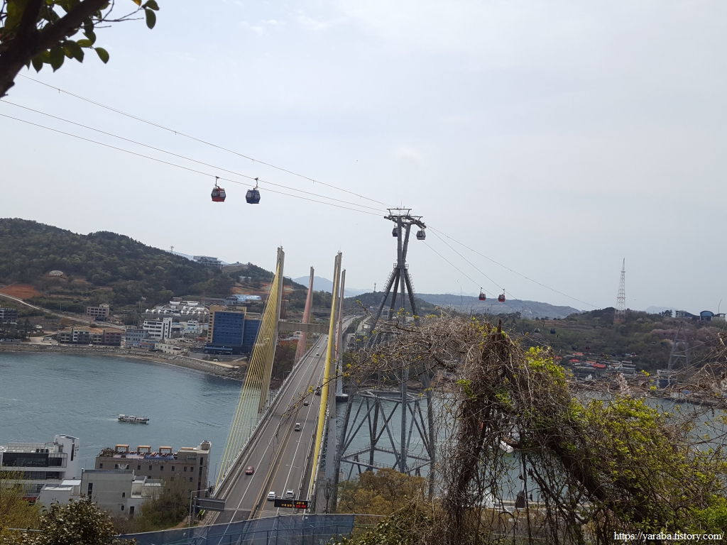 어선이 오가는 바다 너머로 해상 케이블카의 정류장이 있는 돌산 공원도 보이고 멀리 돌산대교도 눈에 들어온다.