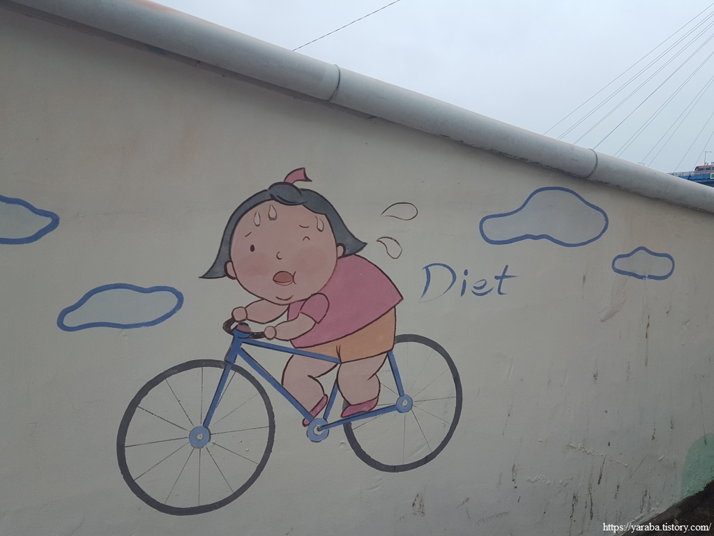 좁은 골목인데도 자전거길이란다. 자전거를 끌고 가라는 안내판에 한번 웃고, 자전거로 땀 흘리며 다이어트하는 소녀를 그린 벽화에 또 한 번 미소 짓는다.