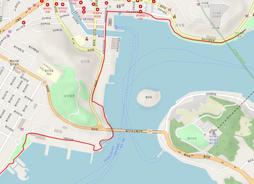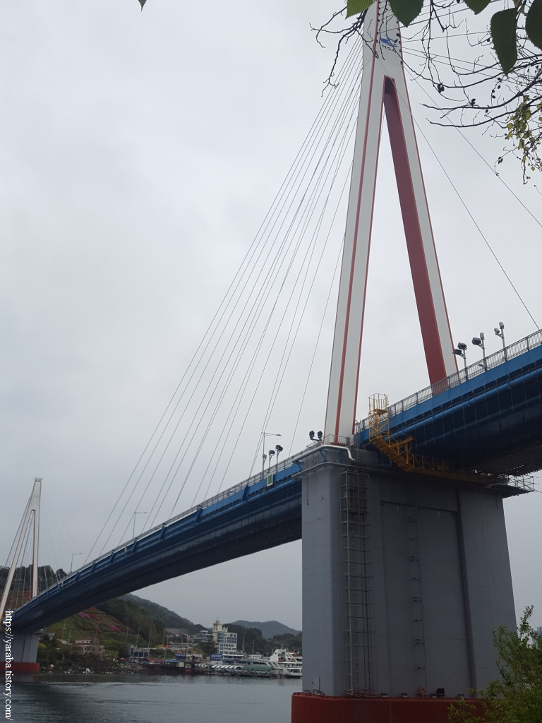여수수산시장을 빠져 나온 길은 얼마간 남산로 도로를 따라 오르막길을 오른다. 바다 쪽으로는 돌산대교가 지척으로 보이기 시작한다.