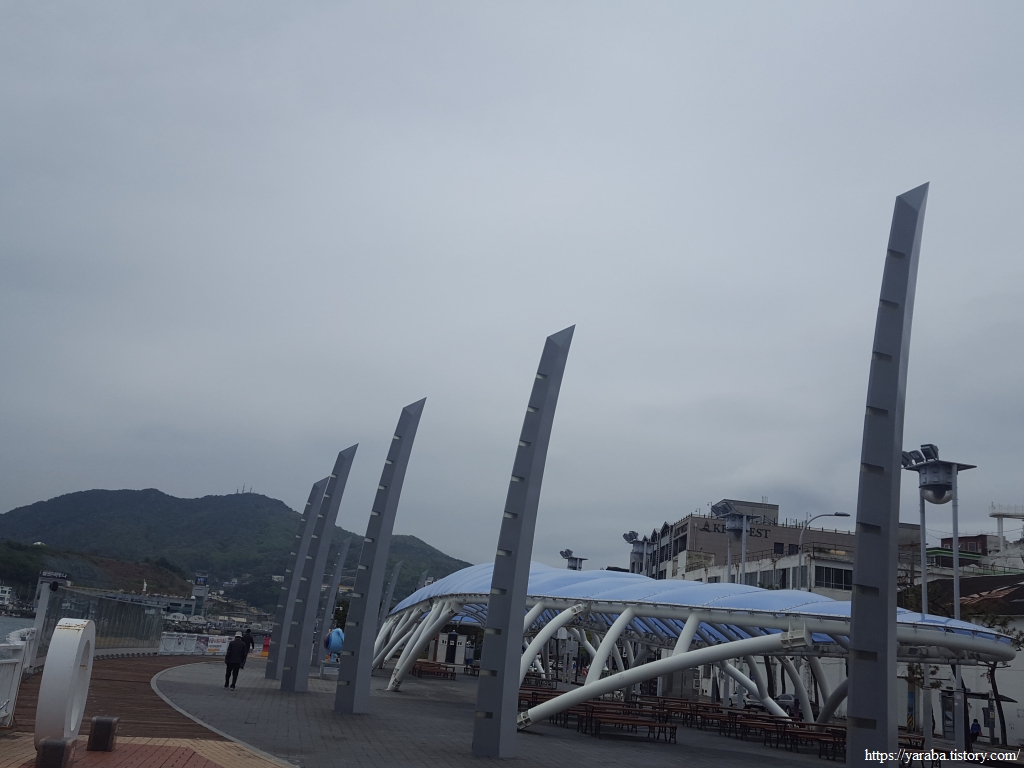 여러 조형물과 바다를 보면서 공원을 걷지만 바로 우측은 시장통이라 아침부터 북적북적 분주한 분위기이다.