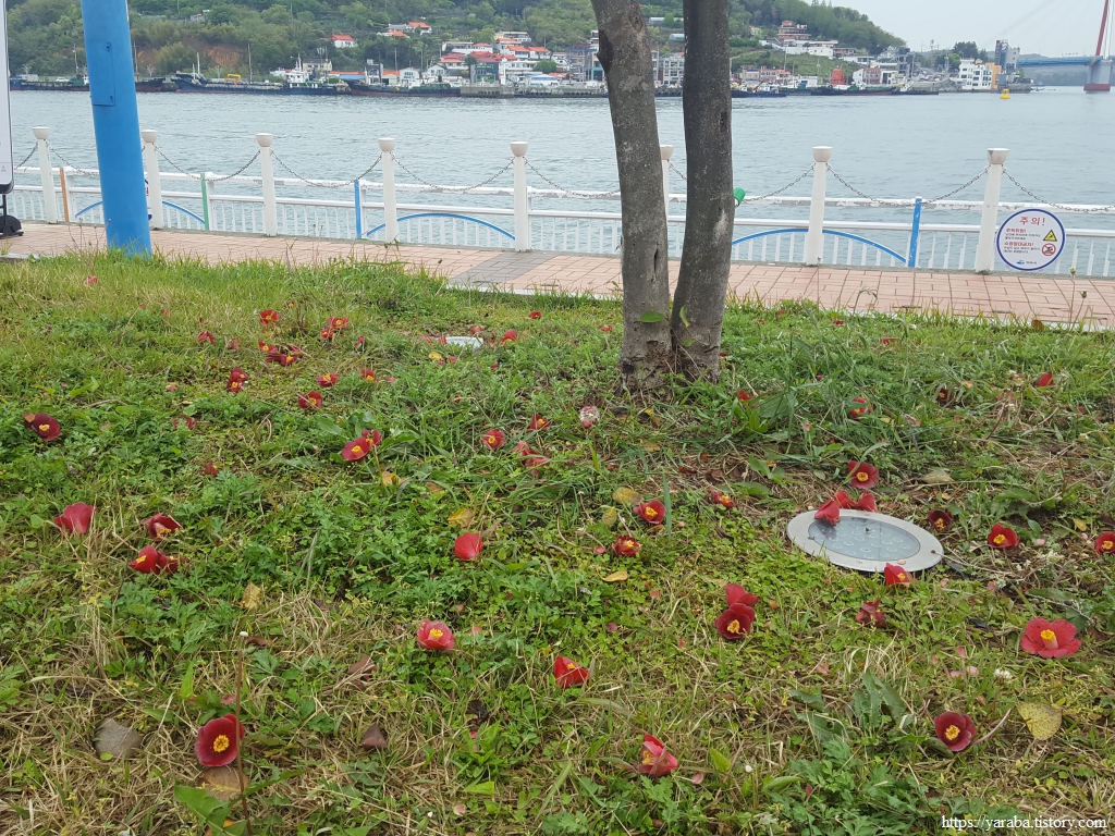 길은 아기자기하게 꾸며 놓은 여수 구항 해양 공원을 가로지른다. 화단 바닥에 붉은 꽃이 가득하다. 떨어진 동백꽃이 만든 그림이다.