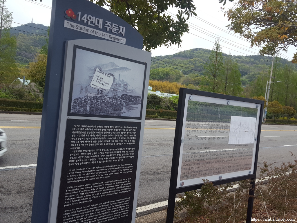 신월로가 직선으로 쭉 뻗어있는 이곳은 사실 일본군이 만든 해상 비행장이 있던 곳이다. 지금은 흔적이 거의 남지 않았지만 활주로 흔적과 비행장 시설들이 남아 있다고 한다. 14 연대 주둔지라는 안내가 있었는데 바로 일제가 패망한 다음 신월 비행장에 주둔한 국군부대이다. 우리나라 근현대사의 아픈 역사 중의 하나인 여순 시건의 시발점이 된 부대이기도 하다.