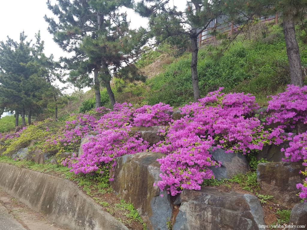 해안 산책로는 더 이상 해안으로 이어지지 않고 철쭉이 화사하게 피어있는 호텔 입구 쪽으로 방향을 잡는다.