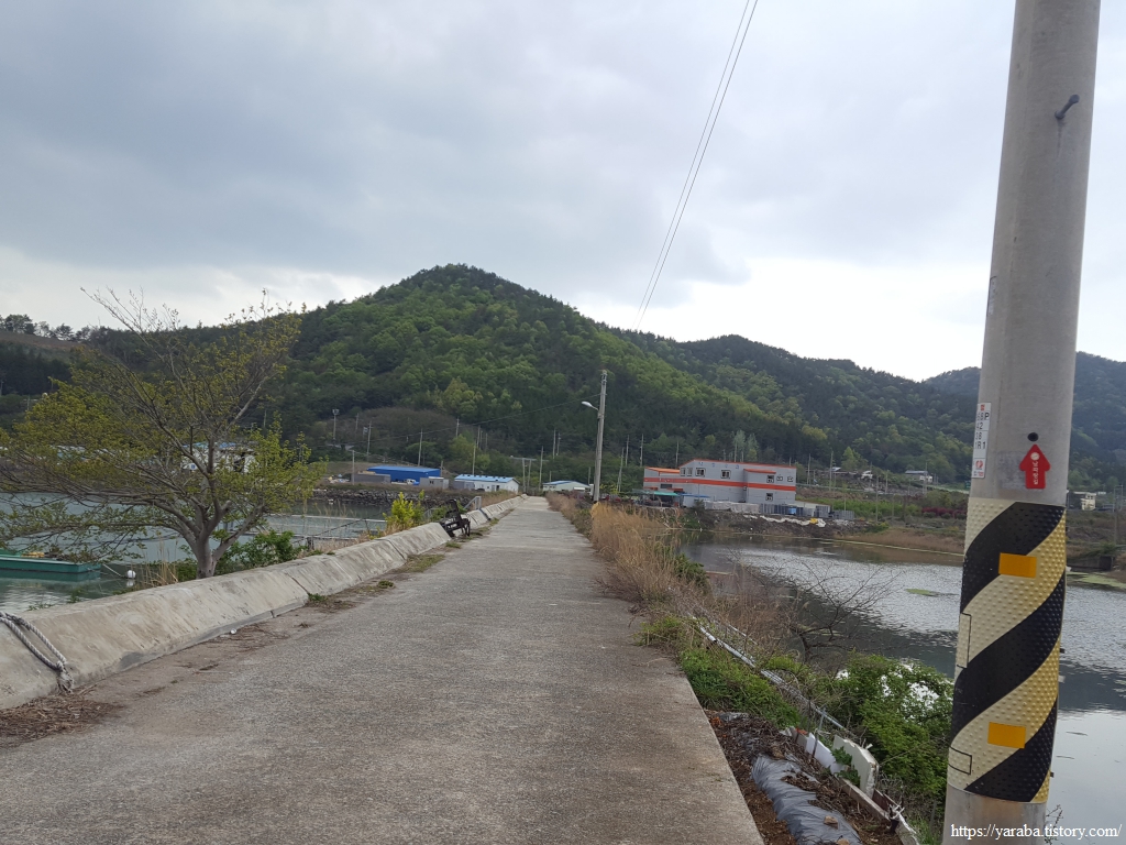 뒷길을 걸으며 보는 바다 풍경도 일품이다. 골재 채취 업체 전용 부두인 모양인데 거울처럼 산과 하늘을 비추며 푸른빛과 초록빛이 도는 호수 같은 바다가 아름답다.