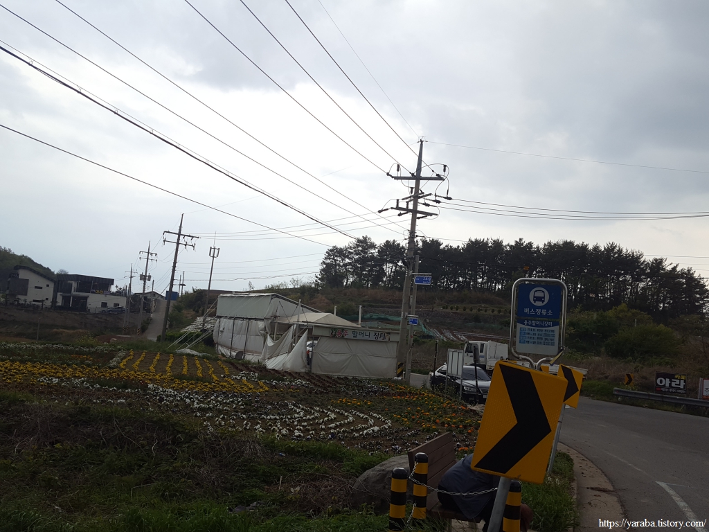 마을 입구에는 "용주 할머니 장터"라는 이름의 버스 정류장이 있었는데 옥수수 수확철이면 인근 밭에서 수확한 옥수수를 이곳에서 직접 파신다고 한다. 장터로 마련해 놓은 천막 주위로는 꽃밭도 조성해 놓았다. 로컬 푸드라는 시각에서도 도농 간 교류라는 측면에서도 참 보기 좋은 모습이었다.