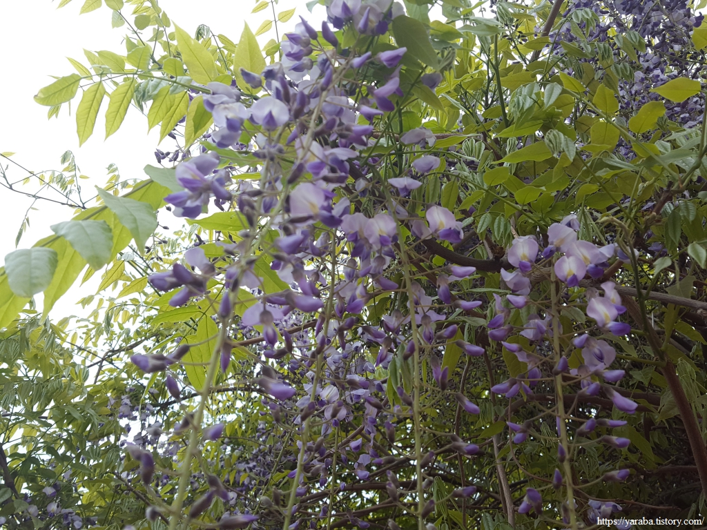 다시 길을 걷기 시작하는데, 중고등학교 교정에서나 볼법한 등나무 쉼터가 우리 눈을 놀라게 한다. 그것도 보랏빛 등나무 꽃이 주렁주렁한 상태로 우리를 맞는다.