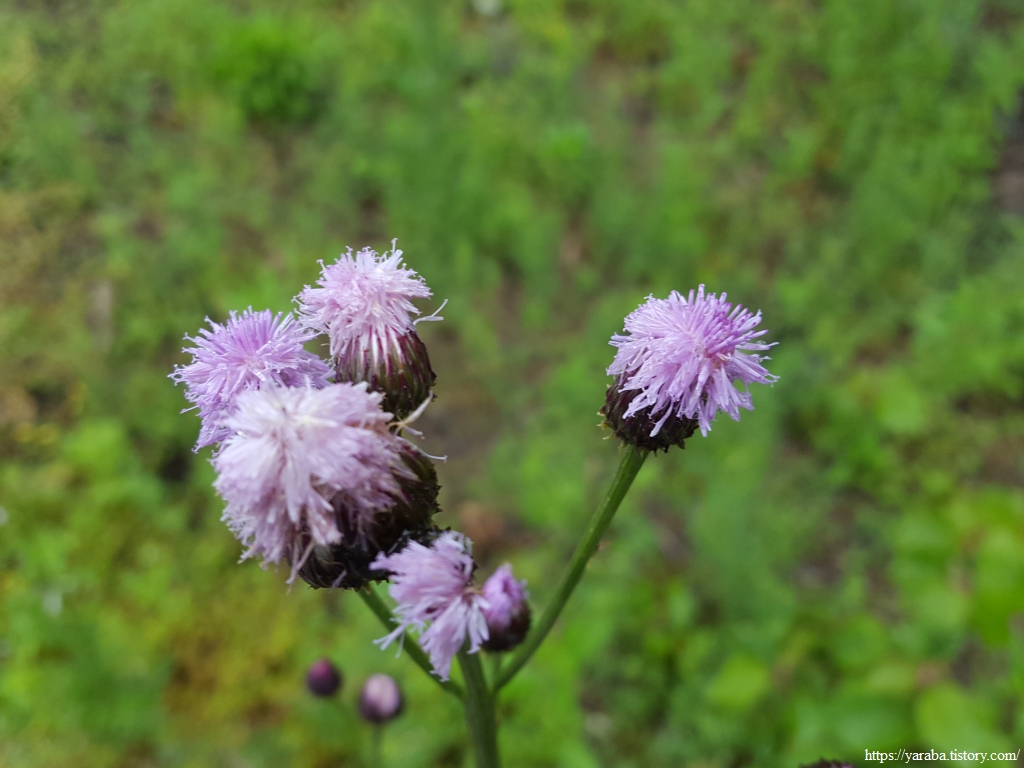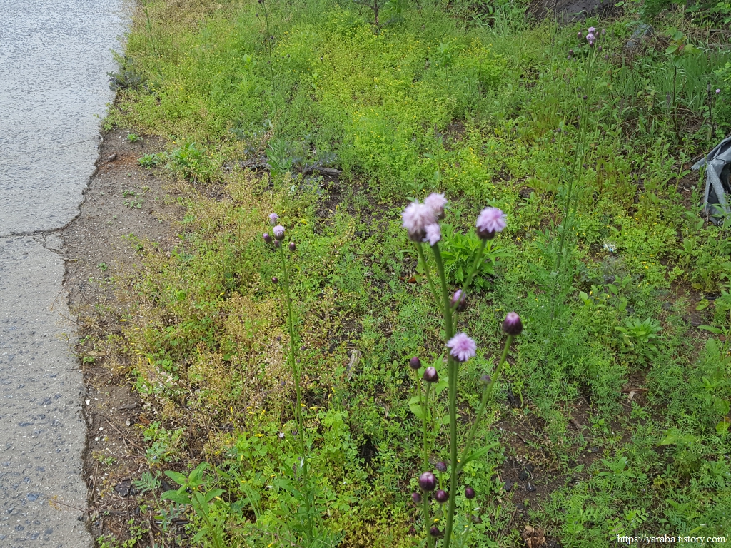 들길에 비에 젖은 보라색 꽃이 있어서 엉겅퀴인가 했는데 알고 보니 지칭개라는 풀이었다. 잡초로 취급하지만 엉겅퀴처럼 약초로 쓰이는 풀이다. 간에도 좋고 항암 성분도 있다고 한다.