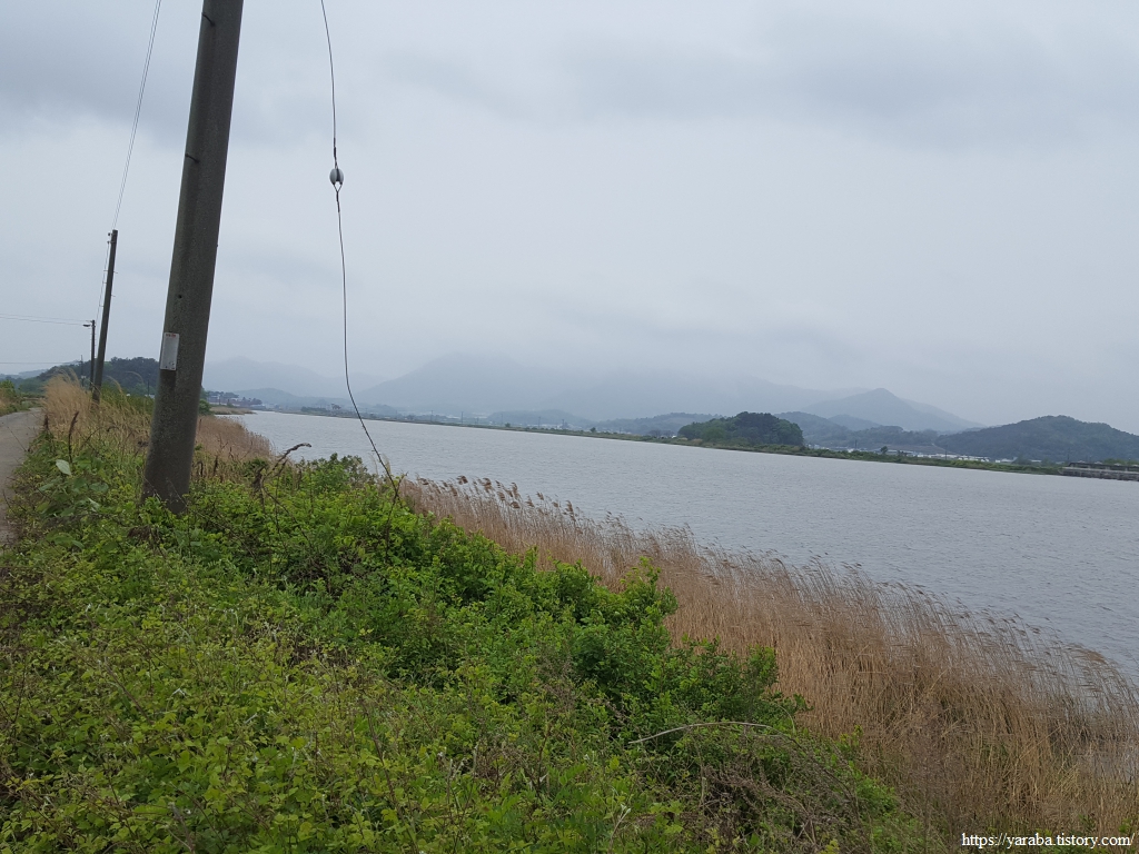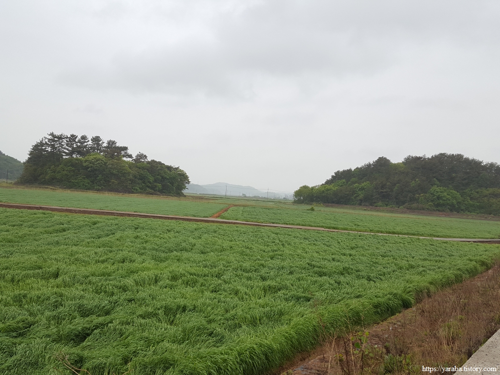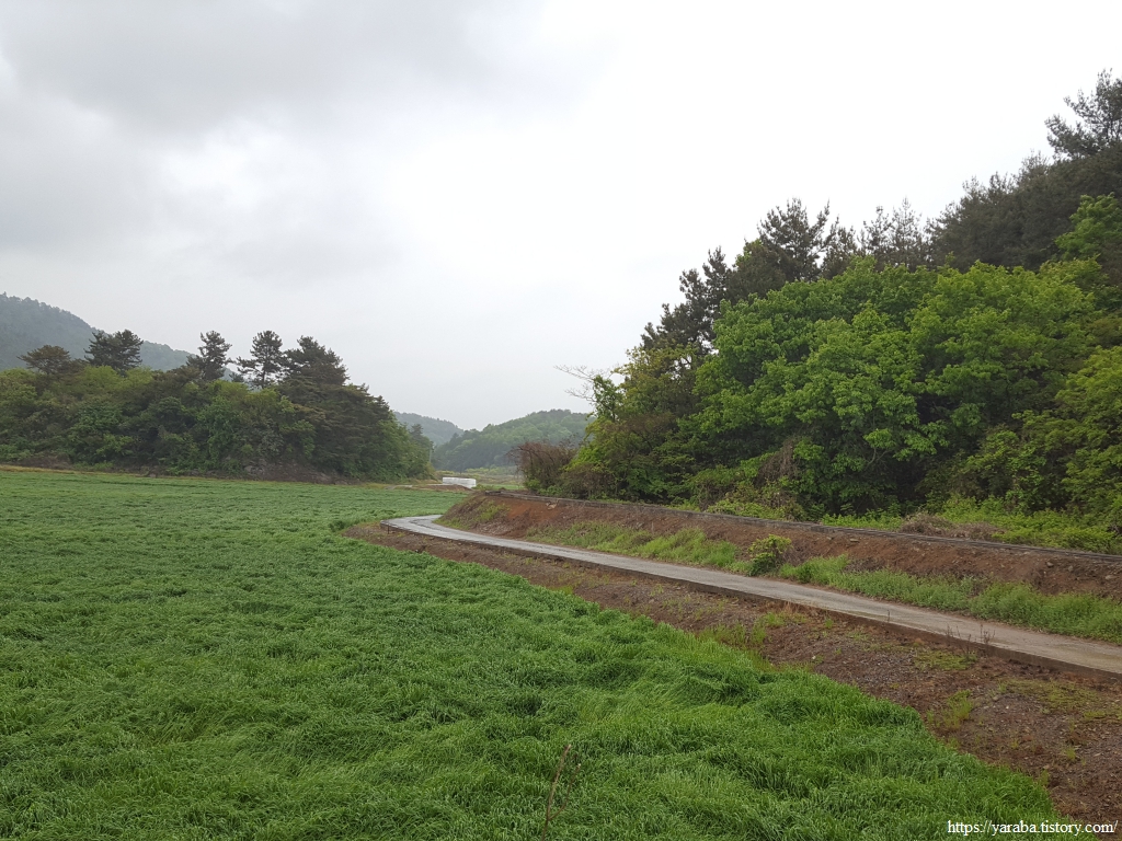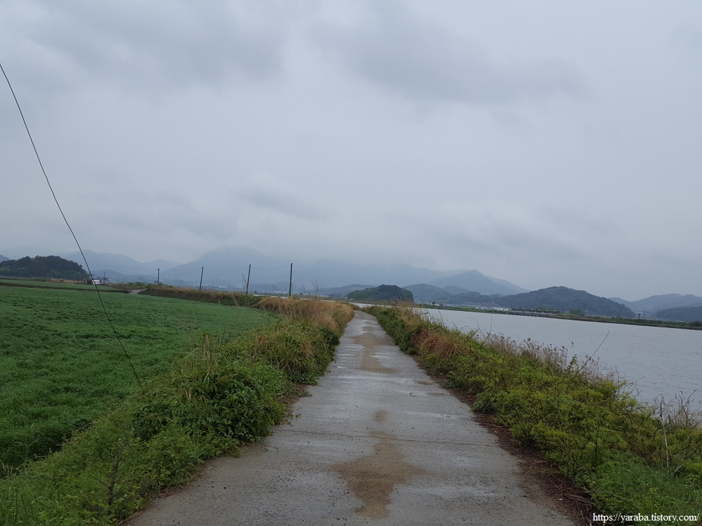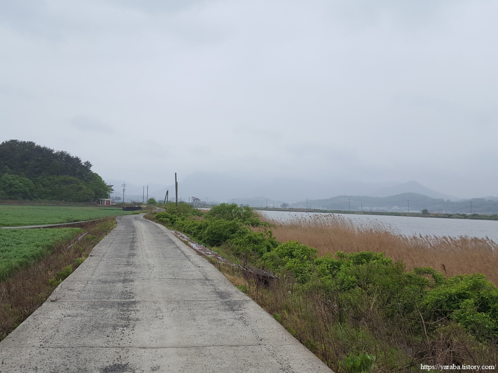 넓은 농경지와 축산을 하는 농가가 많다 보니 넓은 농지는 모내기에 앞서 소먹이 풀들이 푸른 들판을 가득 채우고 있다. 둑방길을 걸으며 푸른 들판과 강을 보며 길을 이어간다.