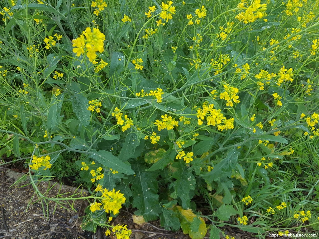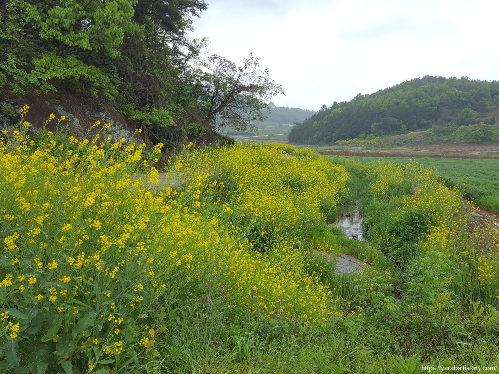 어디서 날아온 것일까? 노란 유채꽃이 길 옆 수로를 가득 채웠다.