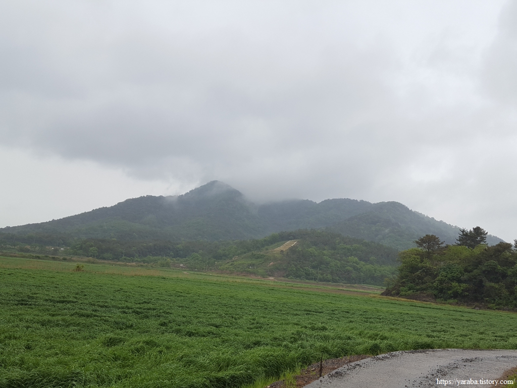 비구름으로 머리가 가려진 망주산를 보며 가는 길은 보슬비가 함께한다.