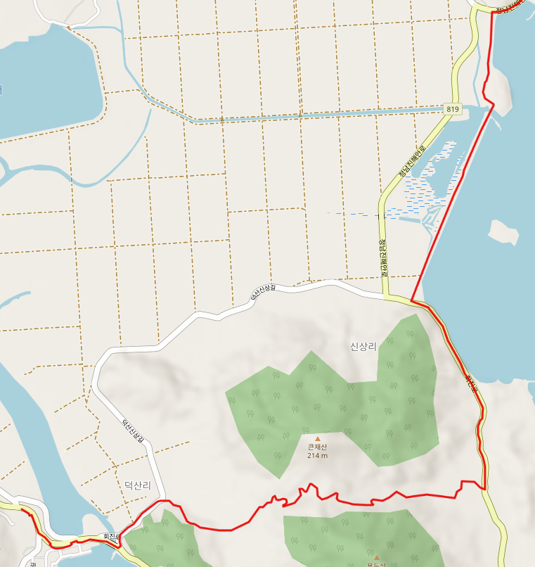 전망대에서 내려오면 해안길을 따라 정남진방조제를 지나고 신상리에서 한승원 생가 인근을 지나며 한재 고개를 넘어 덕산리에 닿고 회진시외버스터미널에서 여정을 마무리한다. 오늘 숙소 후보는 휘게텔(061-867-1500)이고 시내 진입 지점에 하나로마트와 숙소 인근에 편의점도 있다.