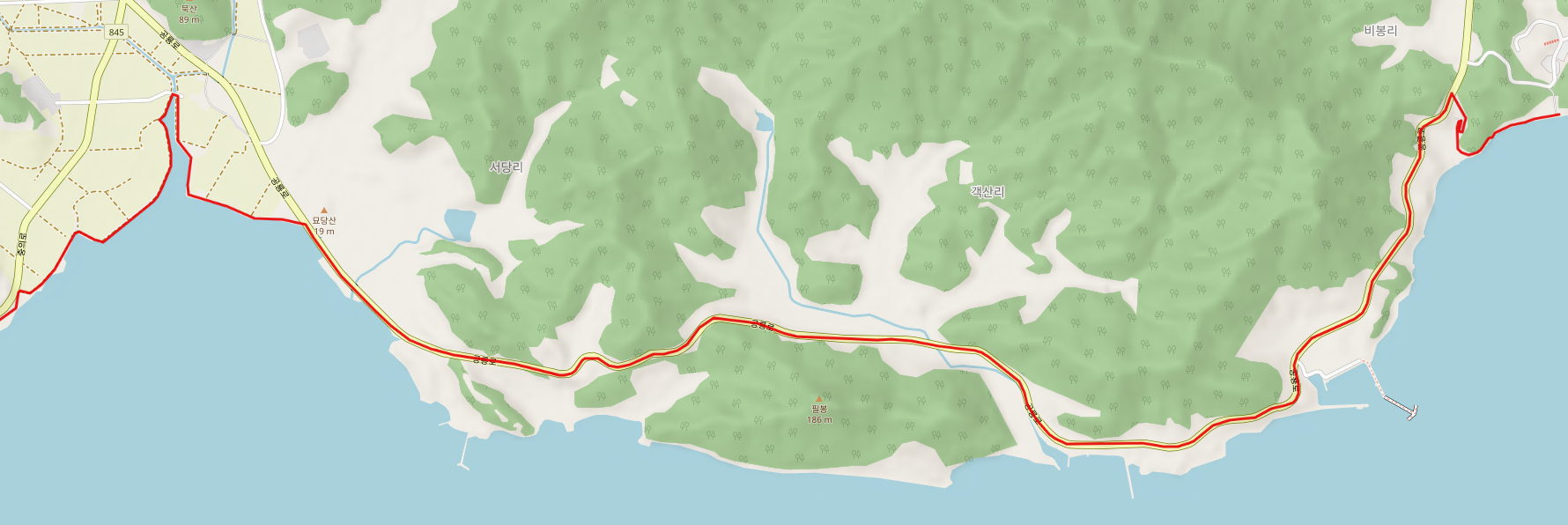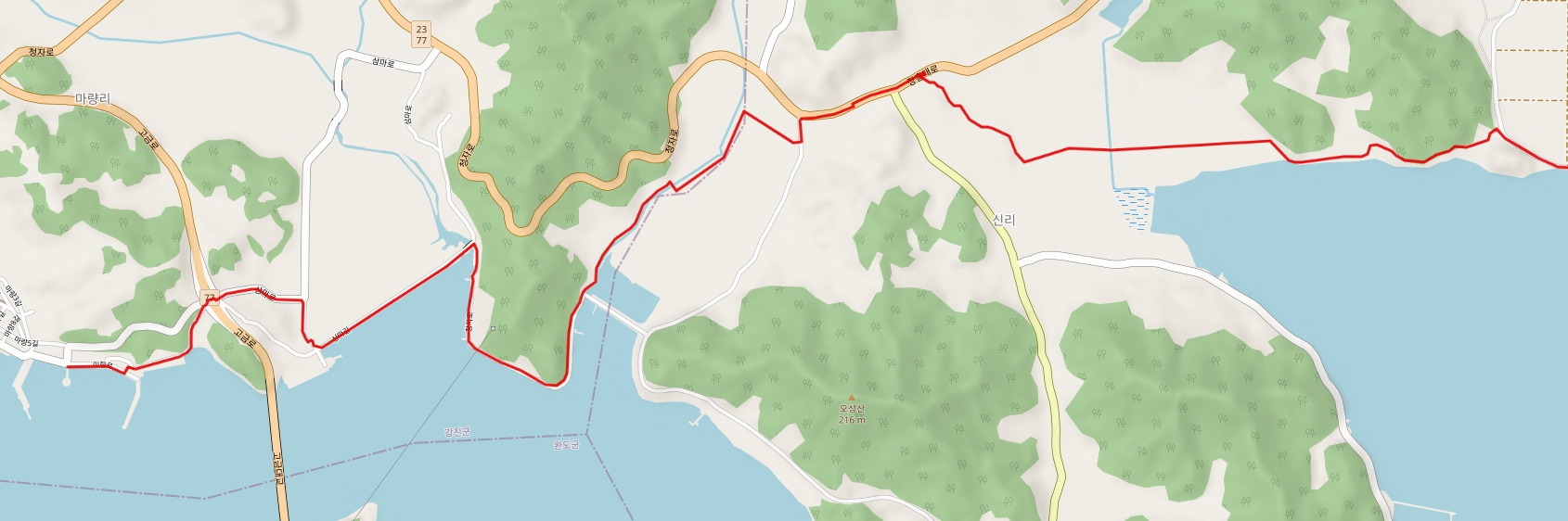 상발 마을 지난 길은 해안으로 나가는데 해안으로 나오면 정남진 해안로 도로를 따라 죽청배수갑문(9.7Km)을 지나 고마리에 이른다. 장흥의 해안을 따라 남쪽으로 내려간다.