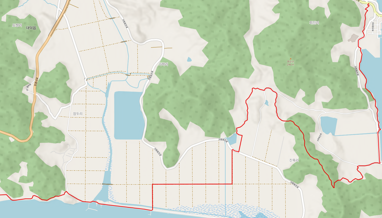 율포해수욕장을 떠난 남파랑길 78코스는 율포항과 명교 해수욕장, 회천 생태공원(2.4Km)을 지나 전일 마을과 군학 마을을 지난다. 남부관광로 도로변을 상당 시간 걸어야 하므로 주의해야 한다.