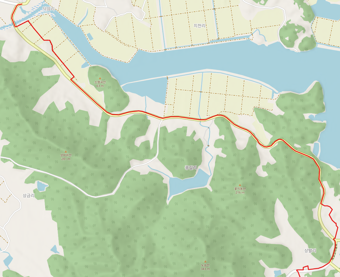 79코스는 상당히 긴 코스이므로 체력 안배가 필요하다. 원등마을회관 앞을 출발하면 덕암풍길로 도로를 따라 상발마을(6.3Km)로 이동한다.